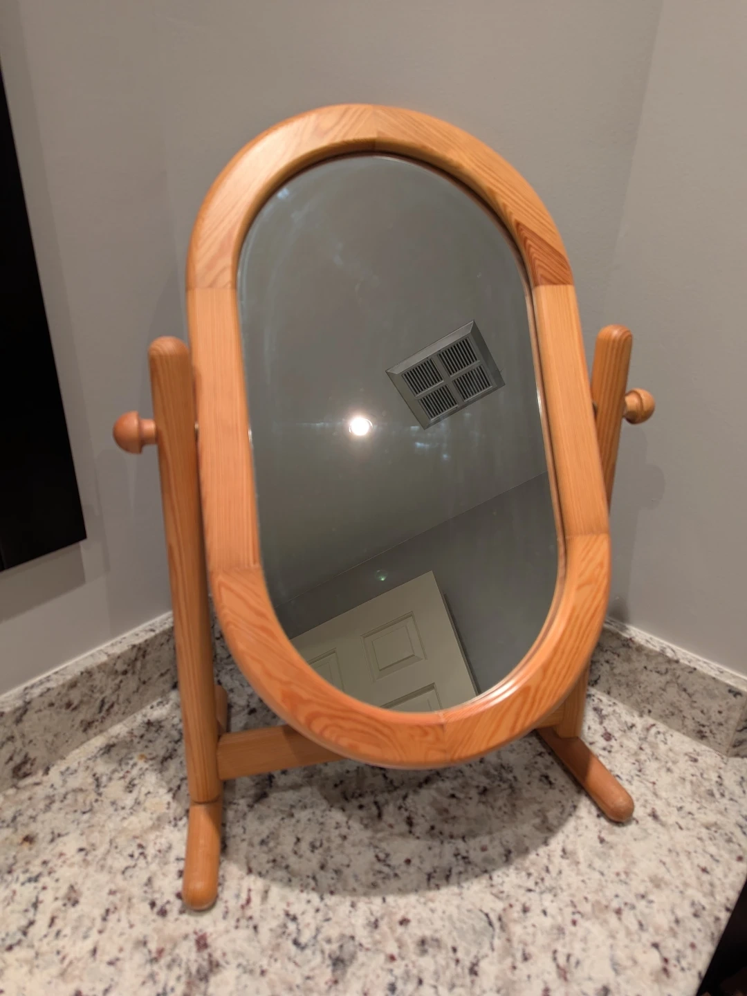 Classic wooden vanity mirror with an oval shape. The frame is made of light-coloured wood. It's perfect for a dresser or countertop.