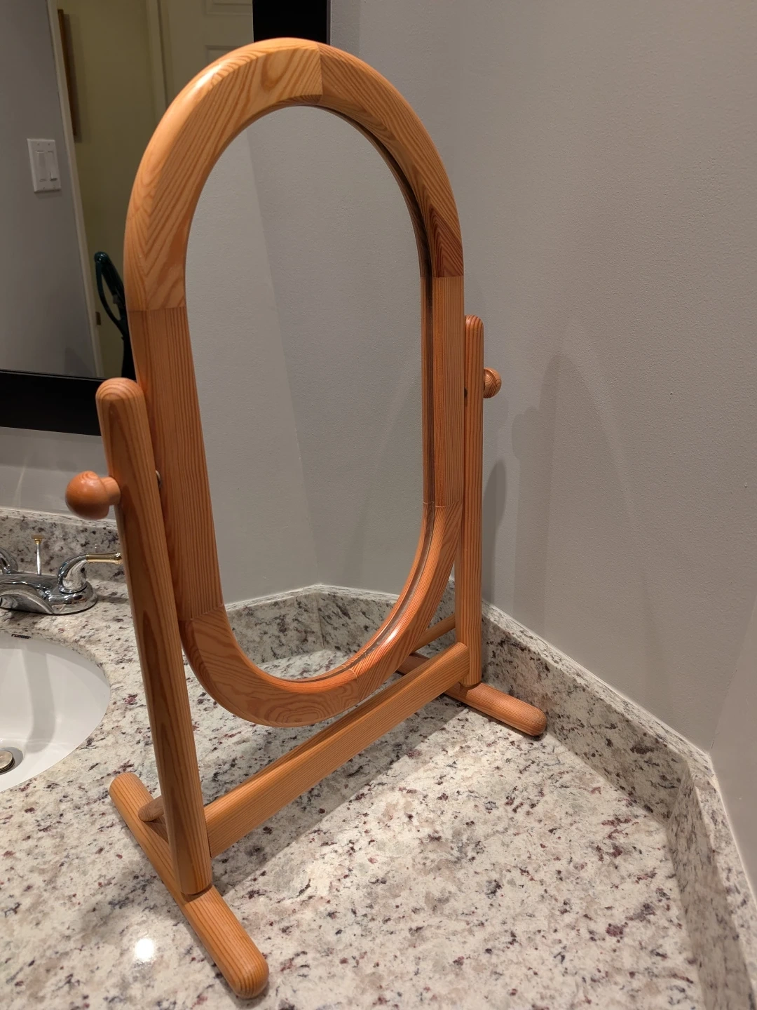 Classic wooden vanity mirror with an oval shape. The frame is made of light-coloured wood. It's perfect for a dresser or countertop.