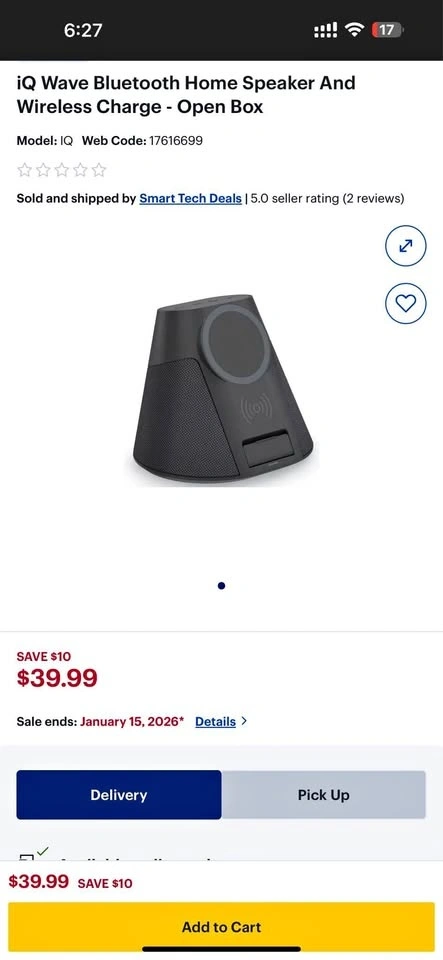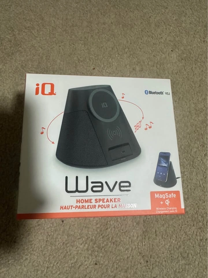 Brand new sealed box. The iQ Wave IQWHS1 Bluetooth Home Speaker and Wireless Charger is a sleek, all-in-one audio and charging solution.