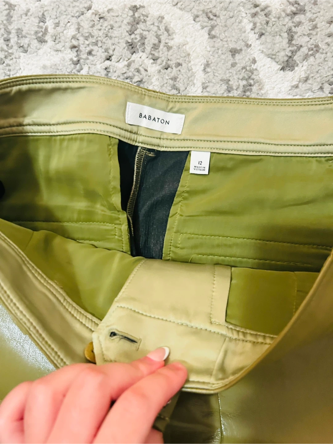 Selling a pair of Babaton vegan leather pants in a unique olive green colour. They are a size 12 and in great condition. These pants are sure to make a statement!