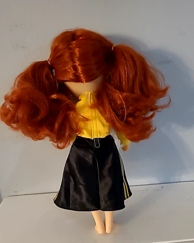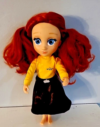 Wiggles Emma Doll Figure, an adorable 13-inch plaything that captures the charm of one of the beloved characters from The Wiggles. Crafted with a mix of materials, this doll features vibrant red hair, bright blue eyes, and a light complexion, accurately reflecting Emma's iconic look. The doll, produced in 2019. Great shape missing shoes.