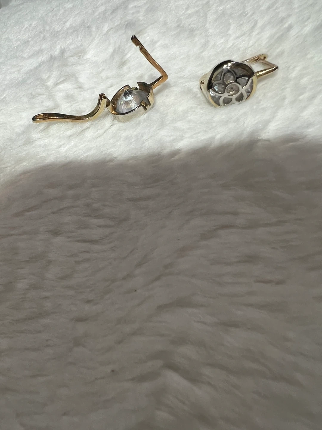Selling a pair of drop earrings with a lovely floral design. They have a gold and silver tone. Perfect for adding a touch of elegance to any outfit!