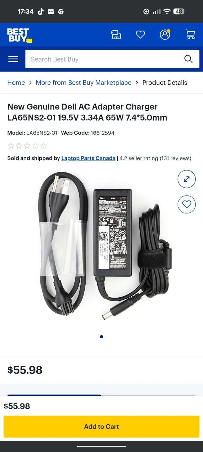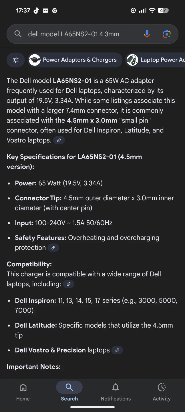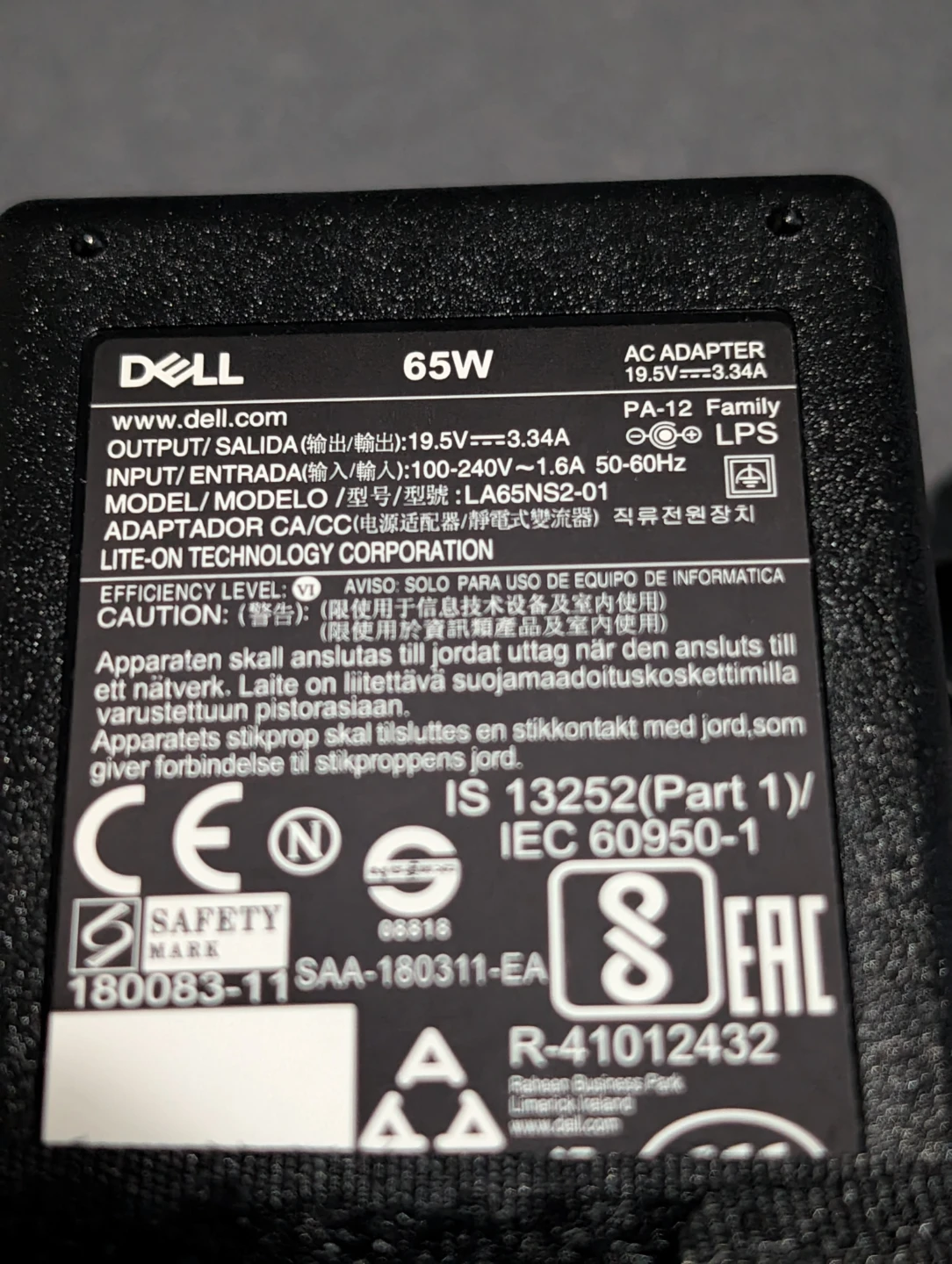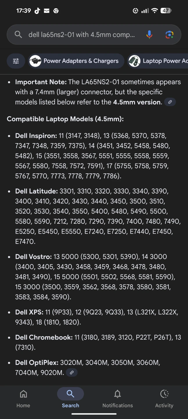 Selling a Dell 65W AC adapter, model LA65NS2-01. This adapter is frequently used for Dell laptops and is characterized by its output of 19.5V, 3.34A. It's compatible with a wide range of Dell laptops, including Dell Inspiron, Latitude, and Vostro & Precision laptops. The connector tip is 4.5mm outer diameter x 3.0mm inner diameter with a centre pin.