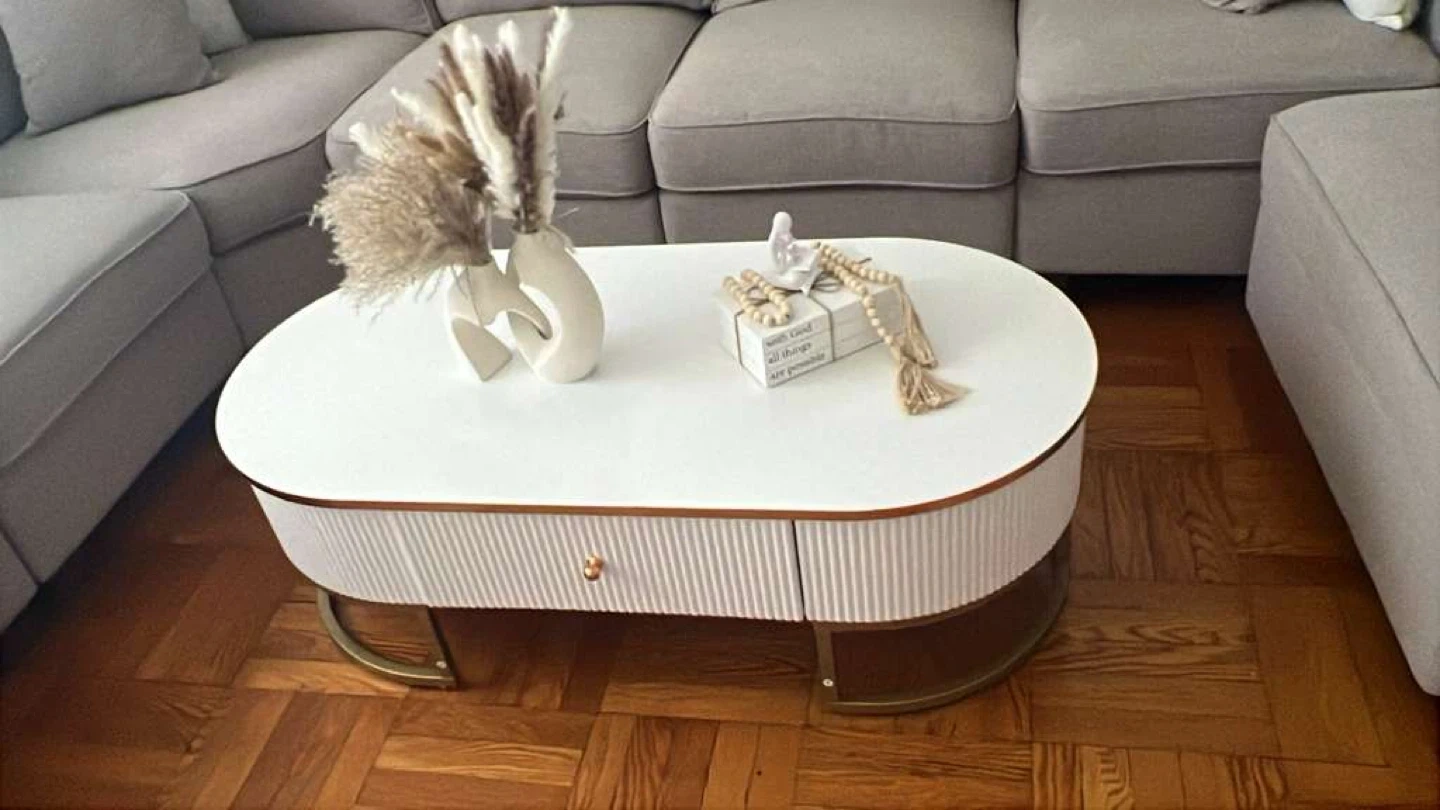 This oval coffee table features a clean white tabletop with a subtle copper trim. It has two ribbed drawers with a single gold-toned pull on the front. The base has gold-toned metal legs for a modern touch. It's perfect for living rooms and provides convenient storage!
