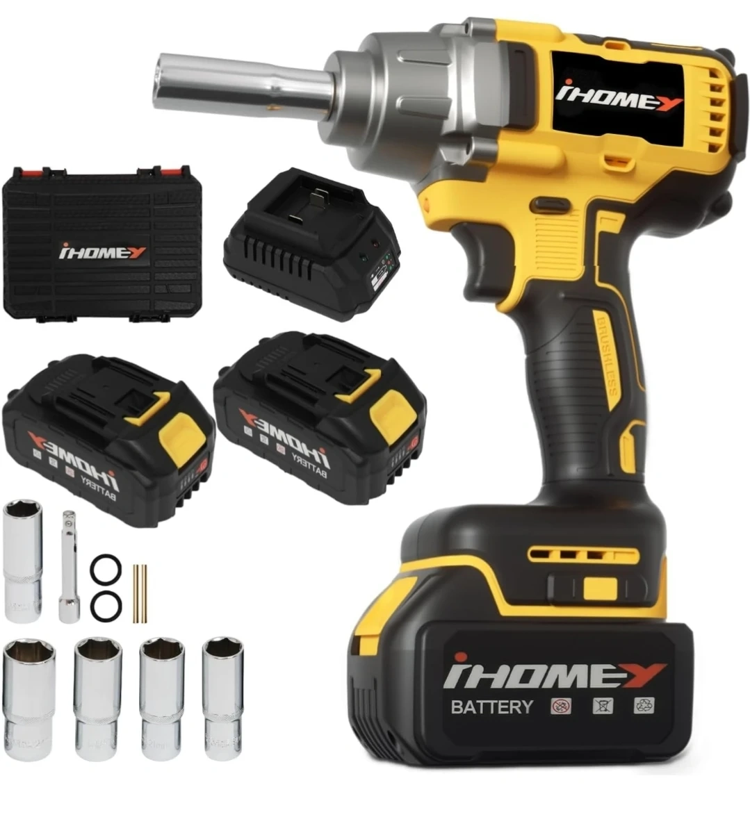 Selling an iHOMEY cordless impact wrench kit! It comes with the wrench, two batteries, a charger, sockets, O-rings, pins, and a carrying case. This tool is brushless for efficient power and long life