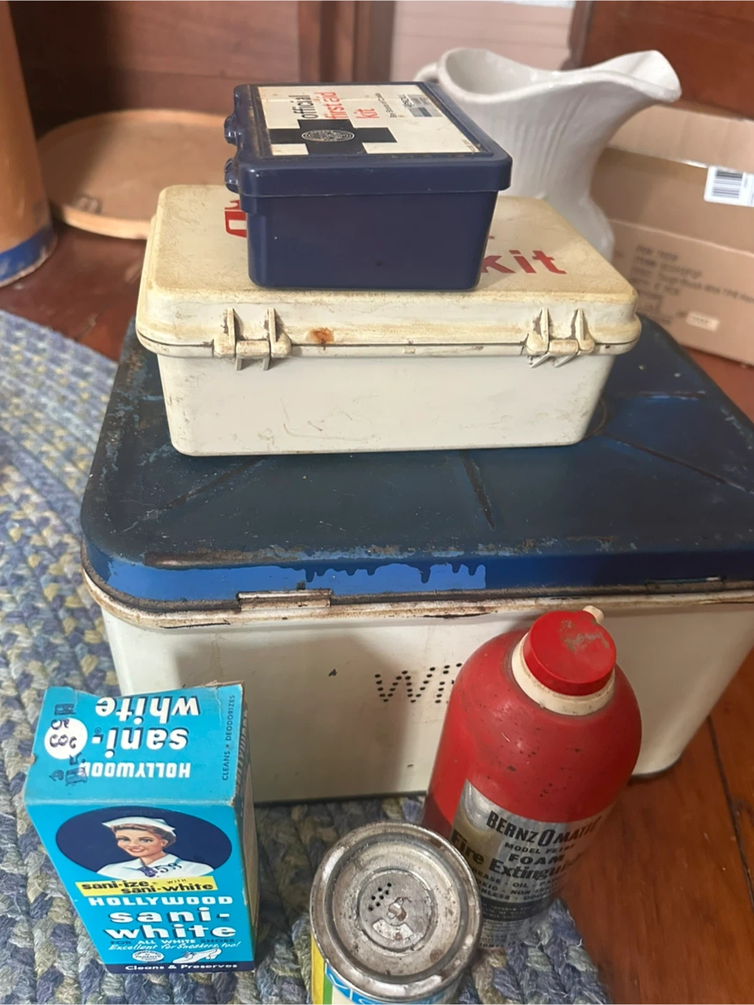 Three vintage containers including a white and blue first aid kit with a smaller blue kit on top. Also includes a red BernzOmatic foam fire extinguisher. A box of Hollywood Sani-White is also present.