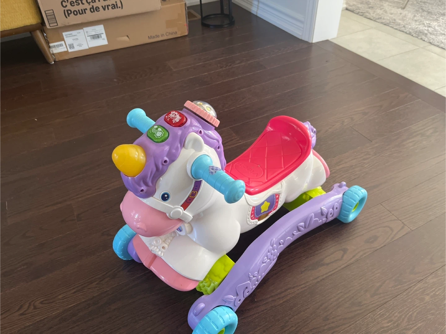 Looking to sell this VTech Rock & Ride Unicorn! It's in great condition and ready for a new home. Your little one will love rocking and riding on this adorable unicorn toy. Batteries included.