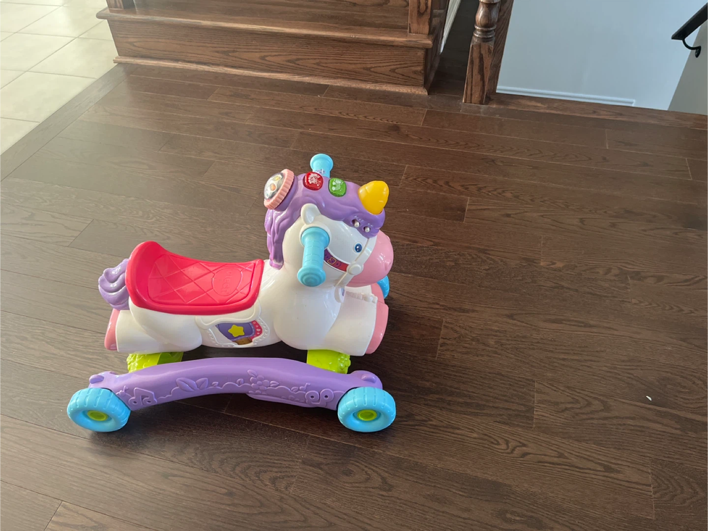 Looking to sell this VTech Rock & Ride Unicorn! It's in great condition and ready for a new home. Your little one will love rocking and riding on this adorable unicorn toy. Batteries included.