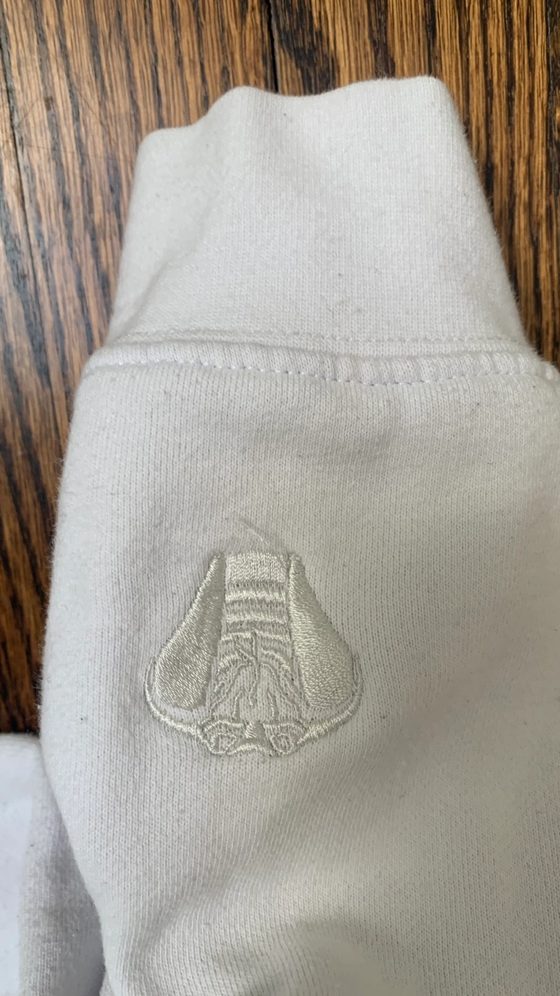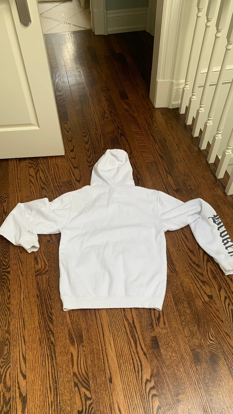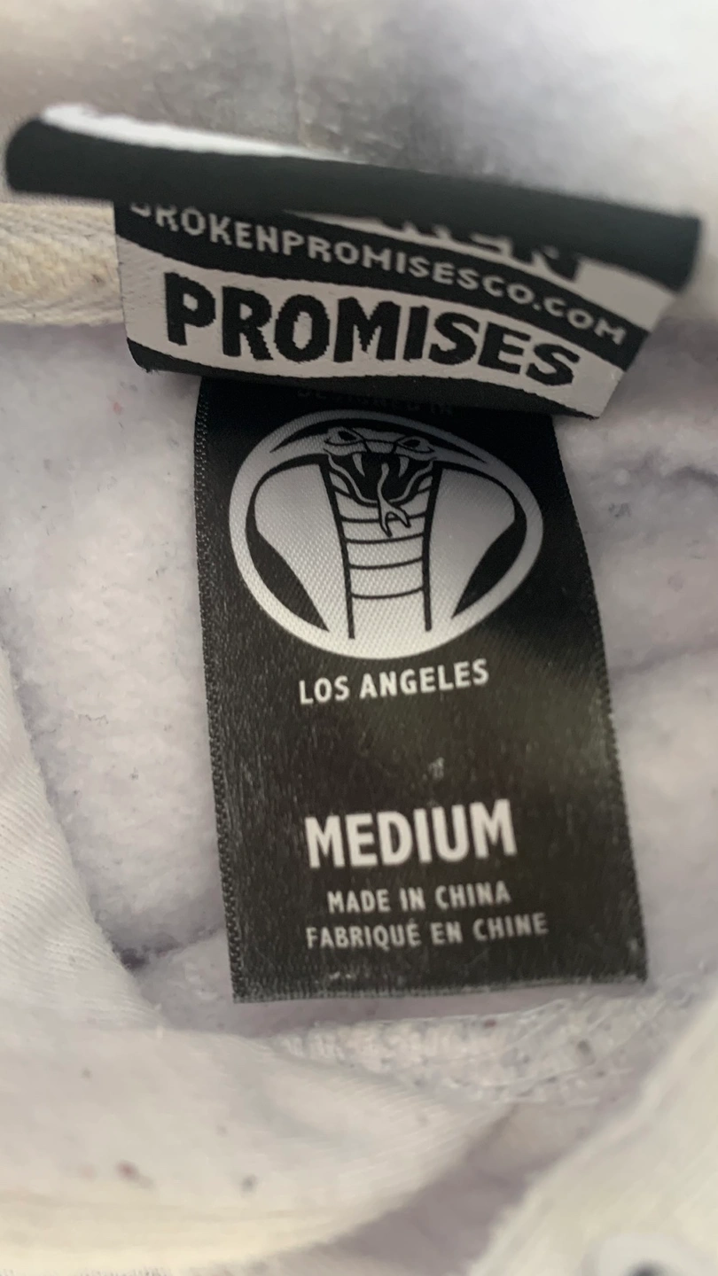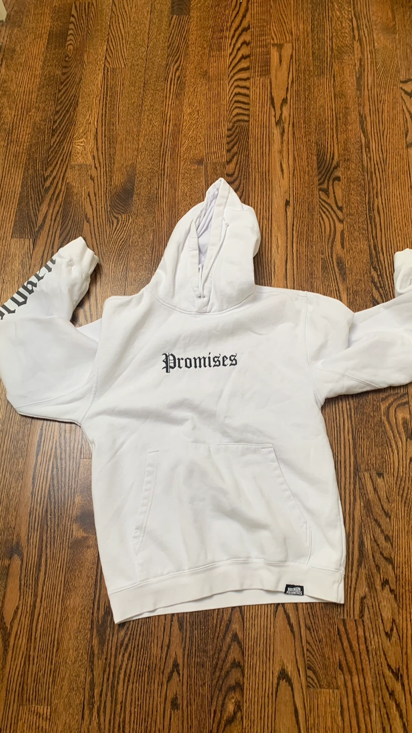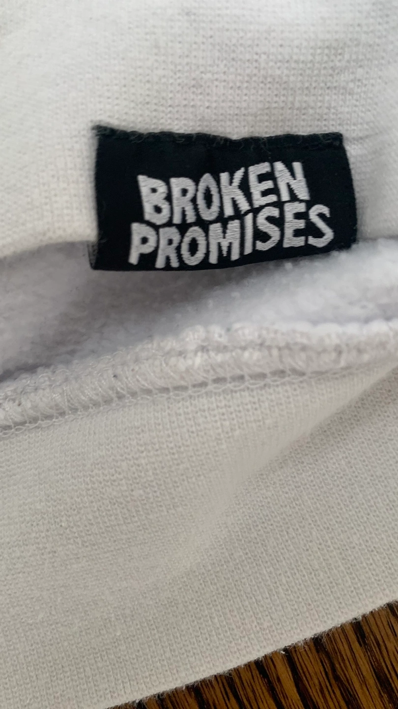 White hoodie with a "Promises" graphic on the front and "Broken Promises" printed on the sleeves.