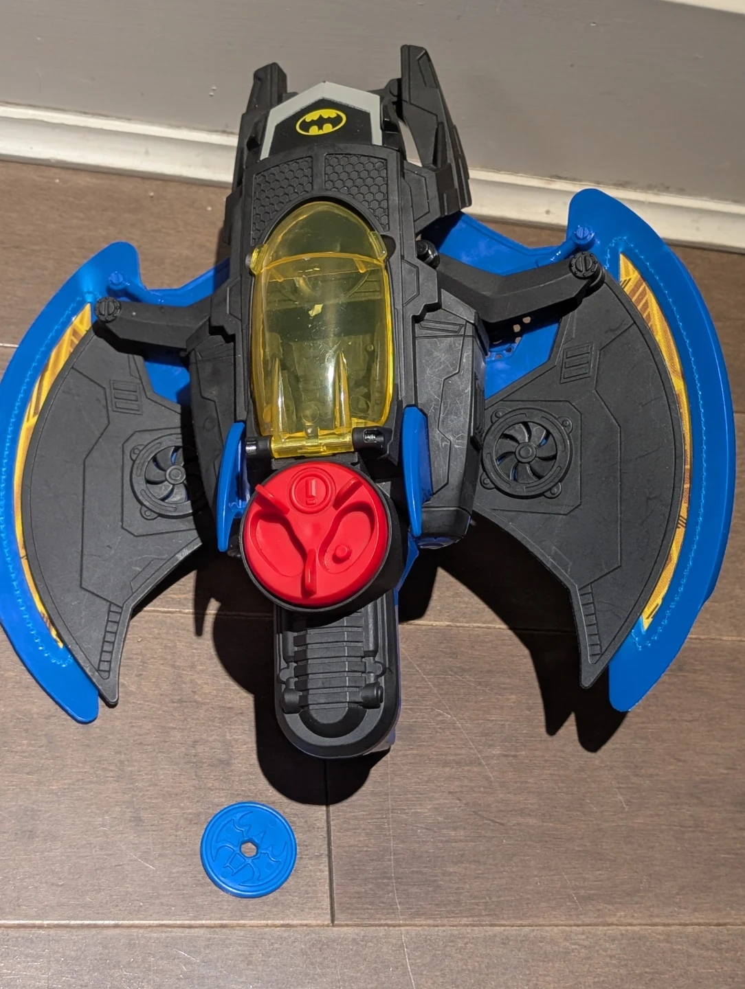 This is a Batman Batwing toy vehicle with blue and black accents and a yellow cockpit. It comes with one blue disc accessory that can be shot from the toy. It's a fun toy for fans of the Caped Crusader!