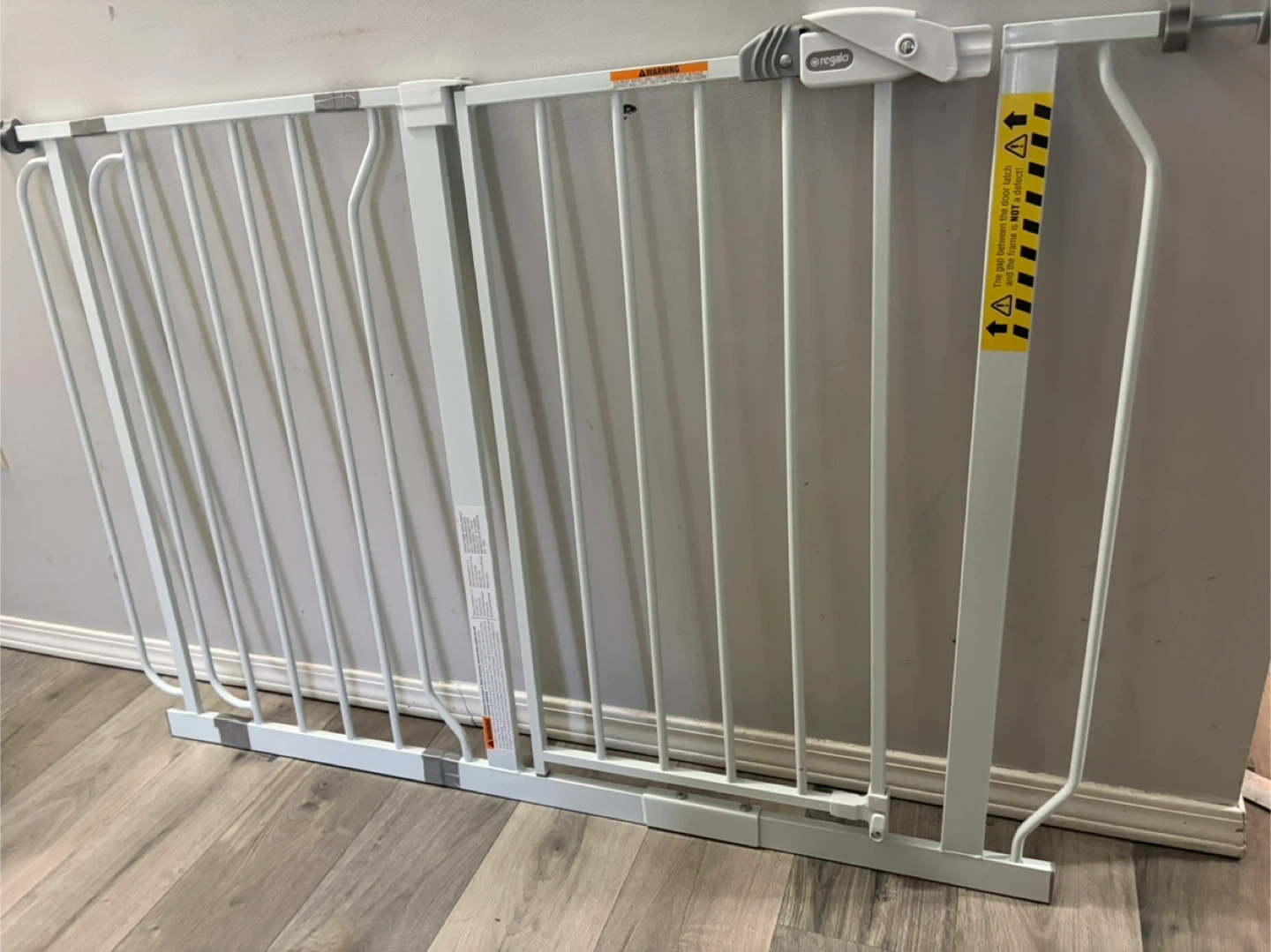 Regalo white metal baby safety gate. It's a pressure-mounted style gate. The gap between the door latch and frame is not a defect.