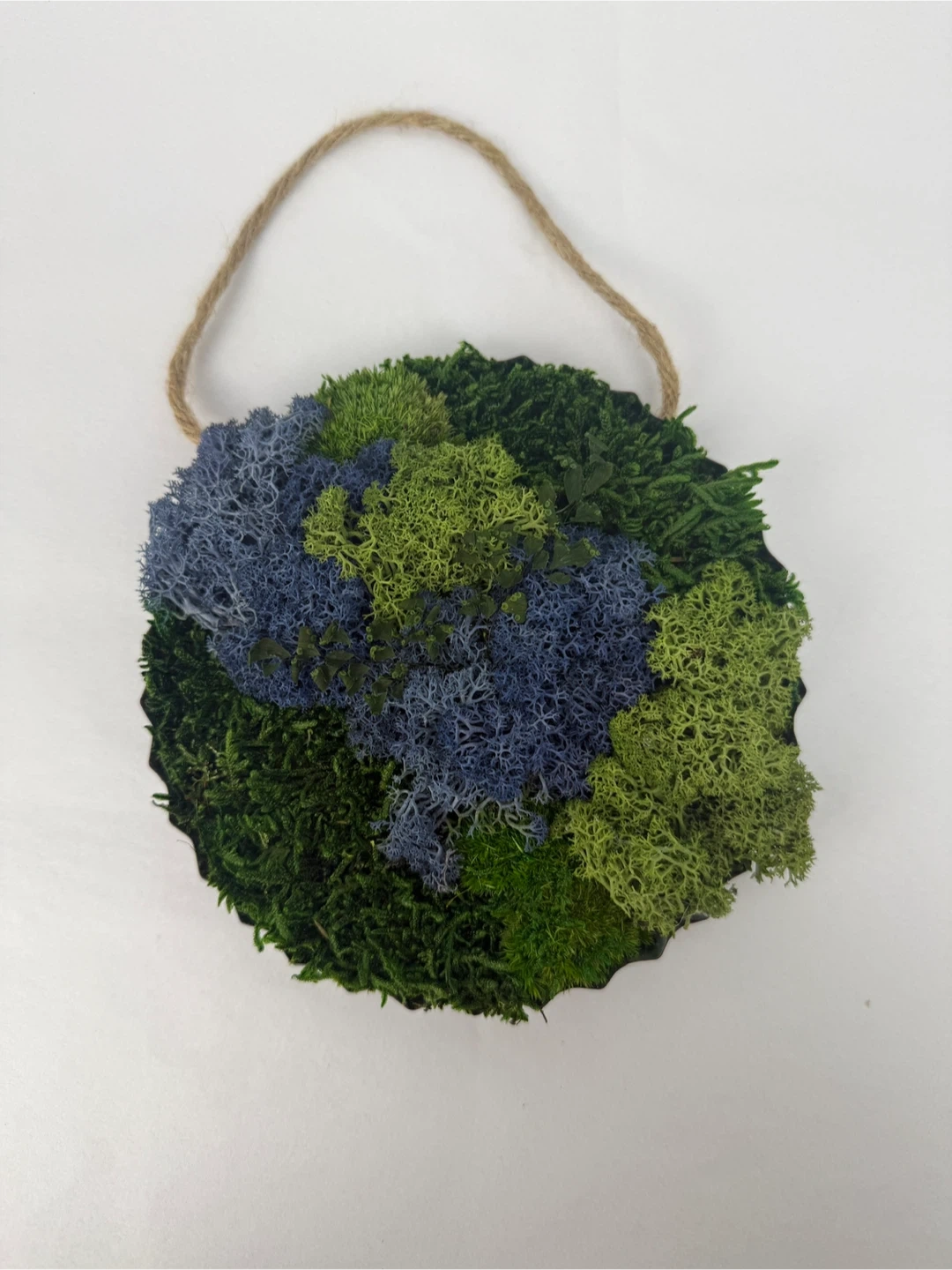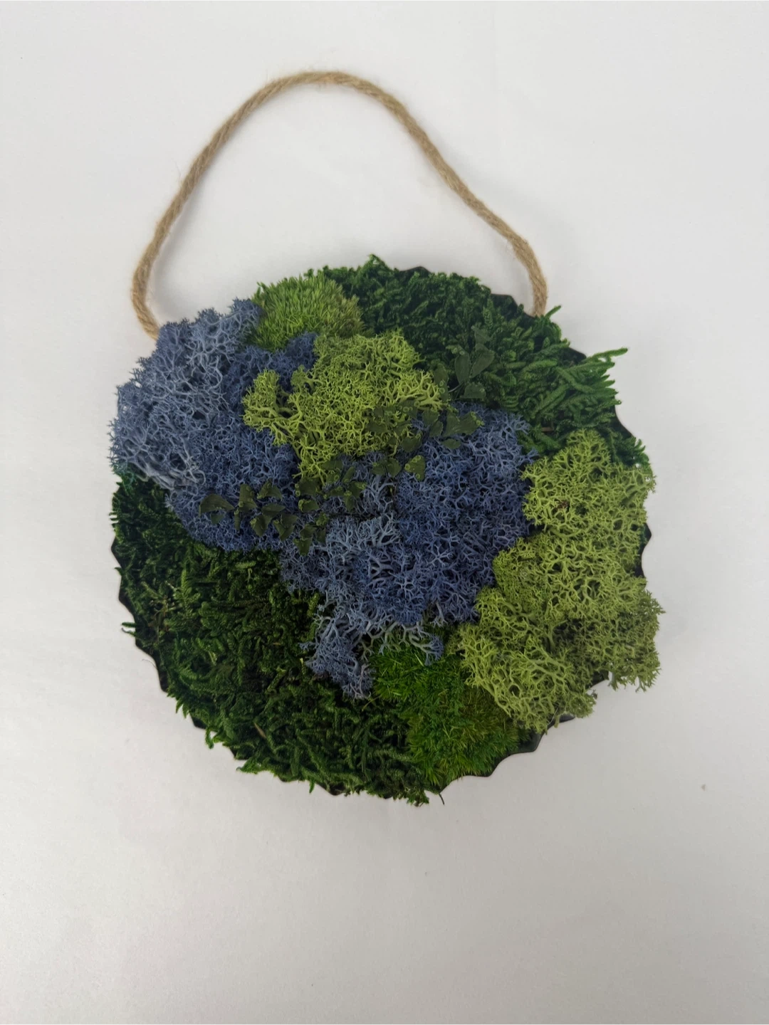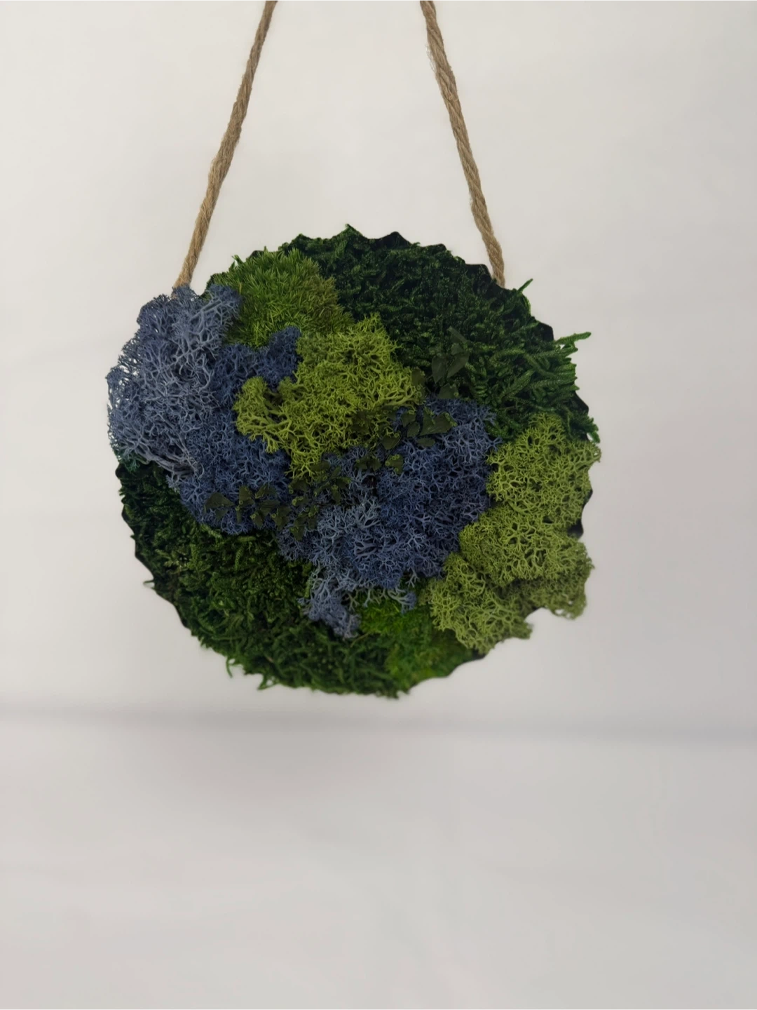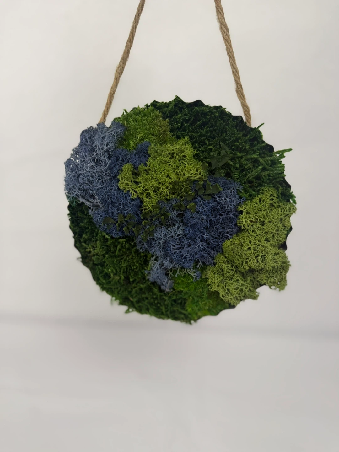 Add a touch of nature to your home with this unique moss wall art! It features a blend of green and blue moss, creating a visually appealing piece. Perfect for adding a natural element to any room 6”