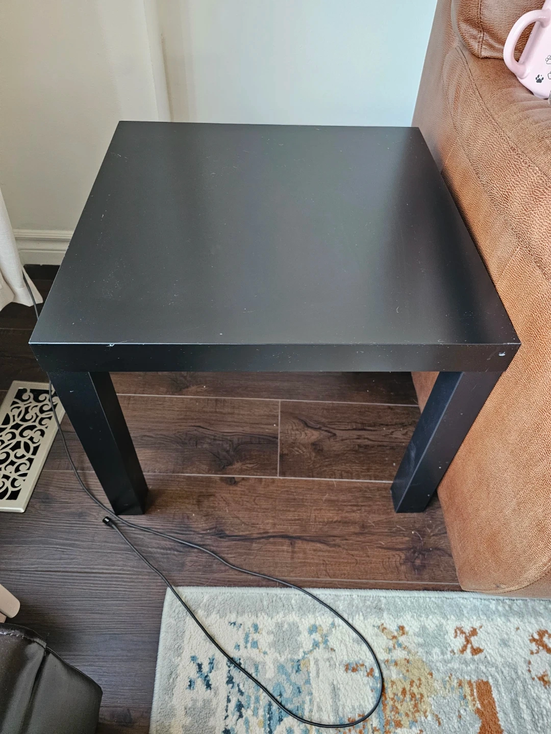 A simple black square side table. It's a useful surface for lamps or drinks. It would fit well next to a couch or chair. Made of sturdy material.
