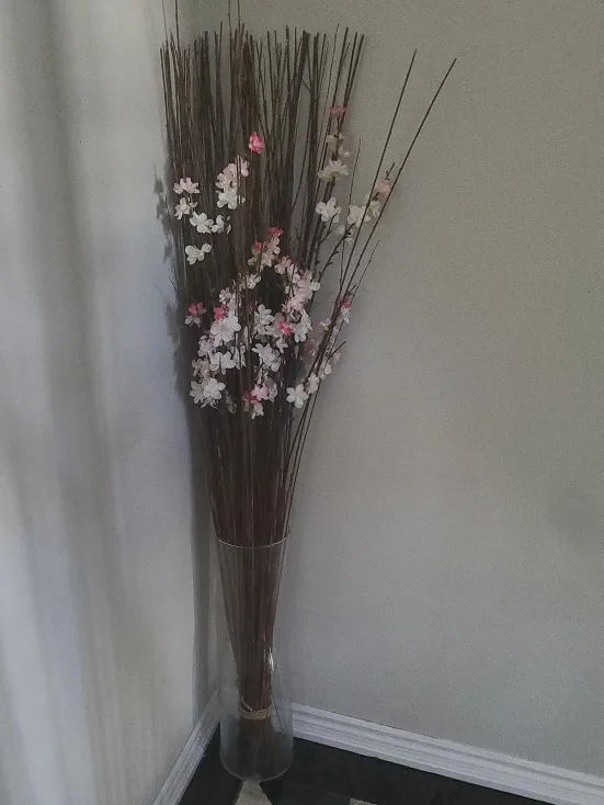 This tall decorative arrangement features dried branches with artificial pink and white flowers. It's housed in a clear glass vase. Provides a touch of nature to any room.