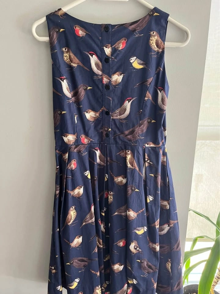 Elegant blue midi dress with a detailed bird pattern. Perfect for everyday wear. 17” bust, 14” waist, 38” length. Buttons down the back. Side zip. Pockets! Purchased this at Doll Factory by Damzels - one of my fav Toronto boutiques!