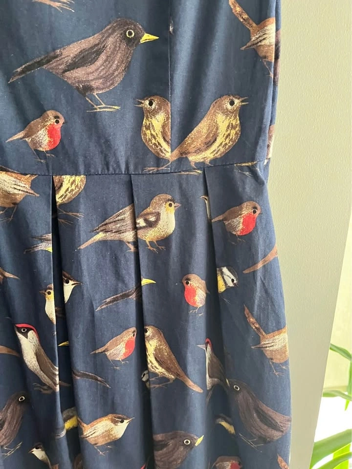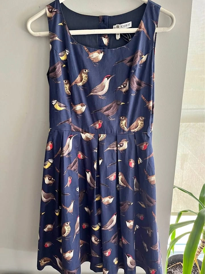 Elegant blue midi dress with a detailed bird pattern. Perfect for everyday wear. 17” bust, 14” waist, 38” length. Buttons down the back. Side zip. Pockets! Purchased this at Doll Factory by Damzels - one of my fav Toronto boutiques!