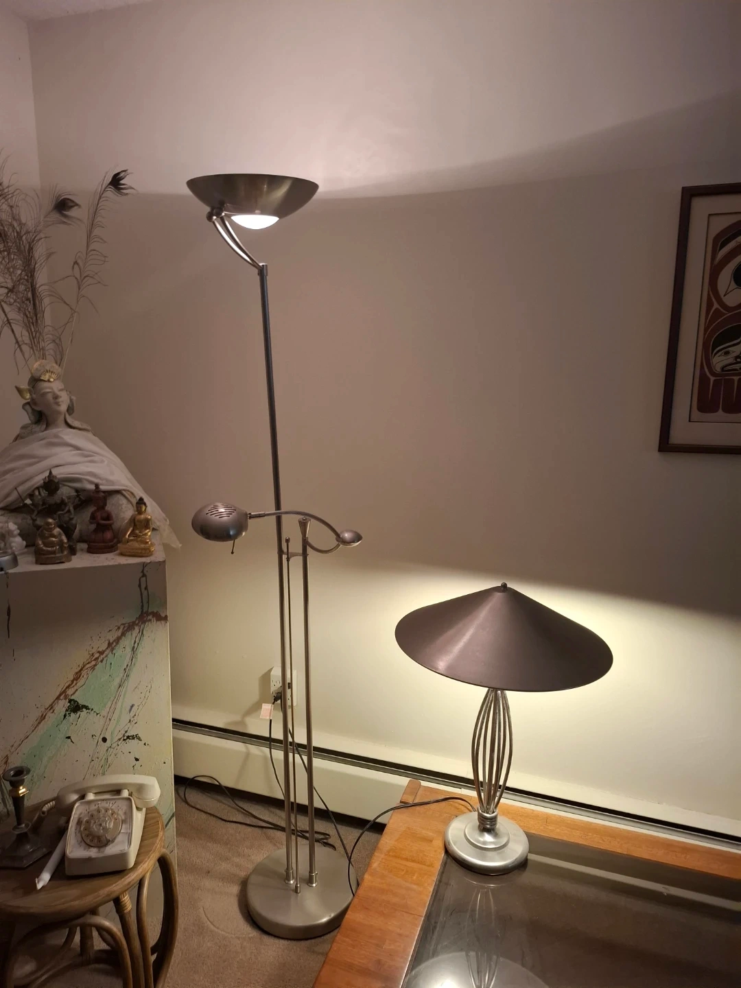Selling a matching set of floor and table lamps! They're in great condition and would look lovely in any living room or bedroom. The floor lamp is tall and provides ample light, while the table lamp is perfect for a bedside table or desk. Both have a sleek, modern design.