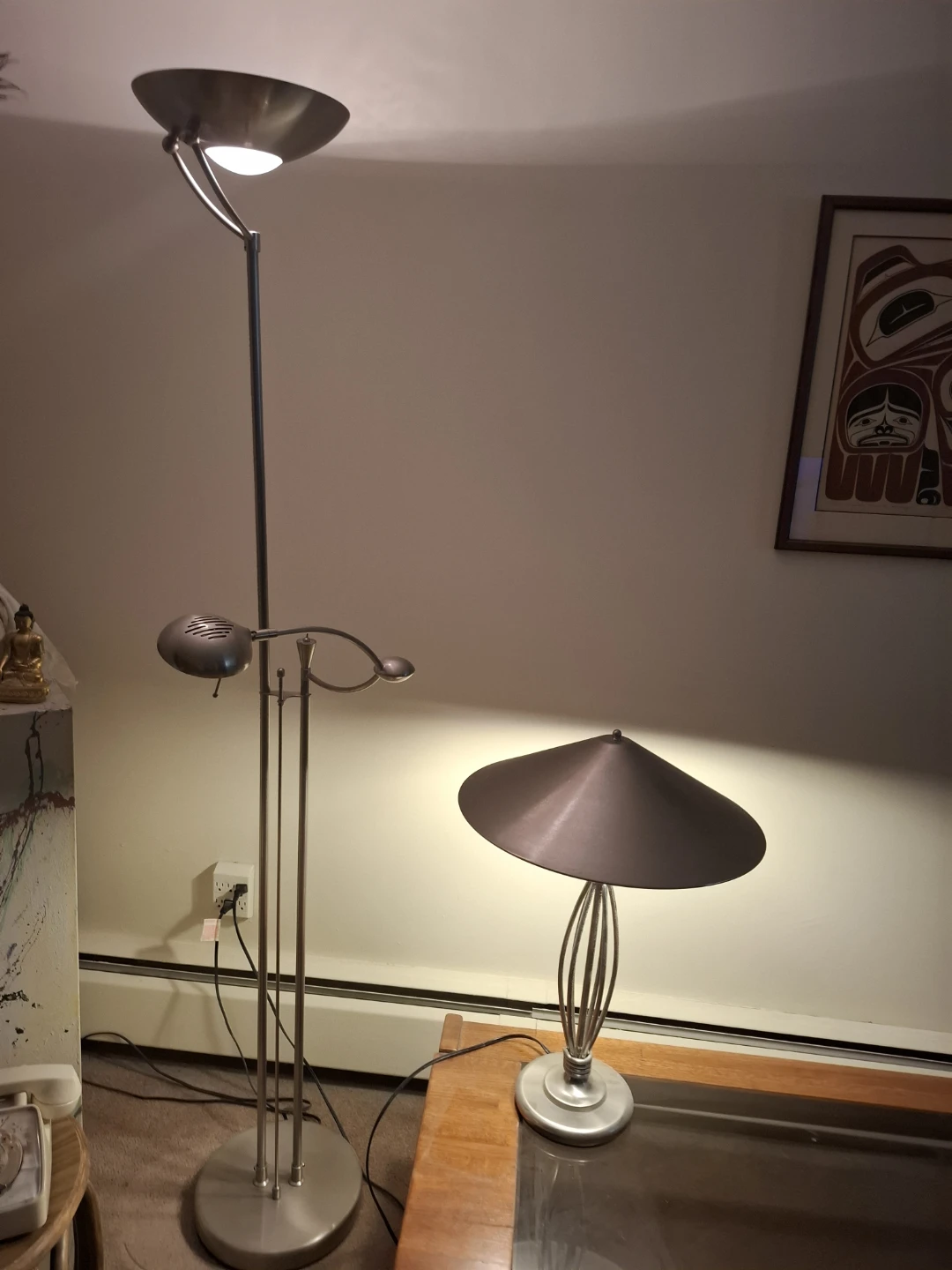 Selling a matching set of floor and table lamps! They're in great condition and would look lovely in any living room or bedroom. The floor lamp is tall and provides ample light, while the table lamp is perfect for a bedside table or desk. Both have a sleek, modern design.