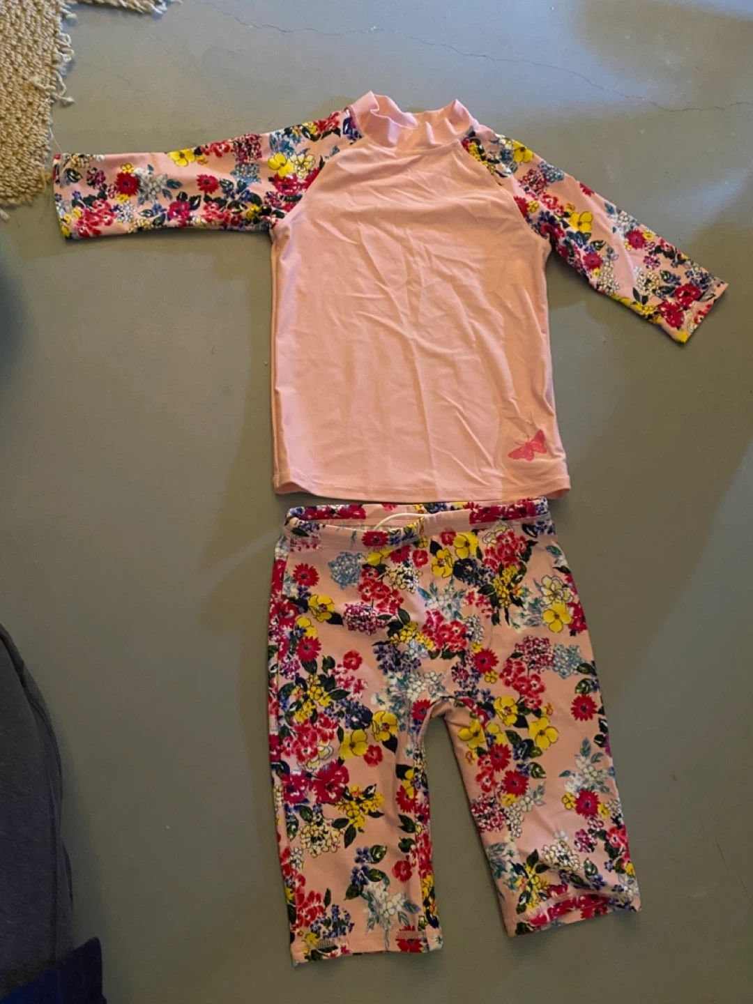 A pink rashguard top with floral print sleeves and matching floral print capri-length leggings. Perfect for beach days or pool fun! Made of stretchy material for comfort.