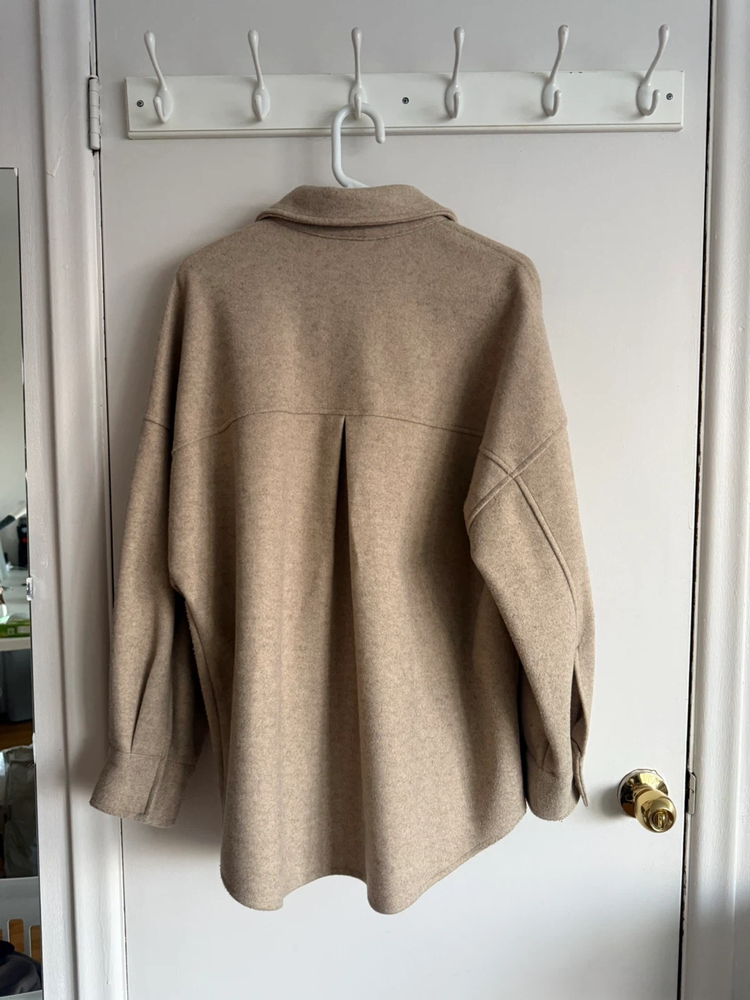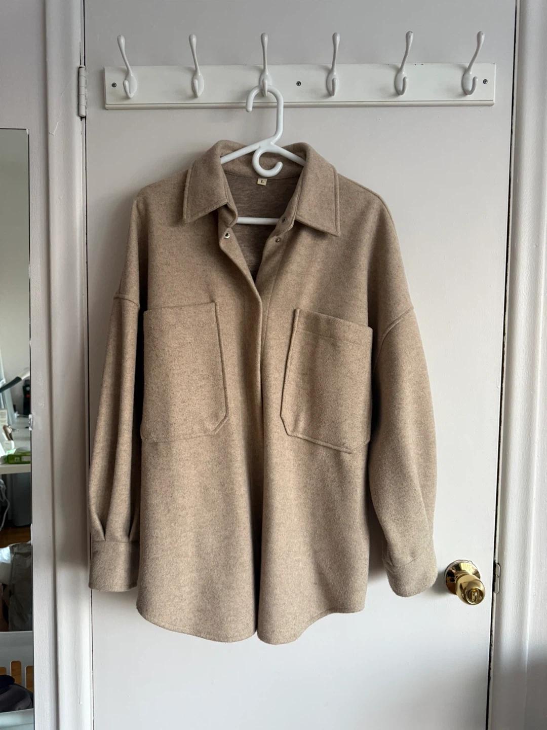 A stylish beige shacket with a relaxed fit. It features two front pockets and a collared neckline. This versatile piece is great for layering in cooler weather.