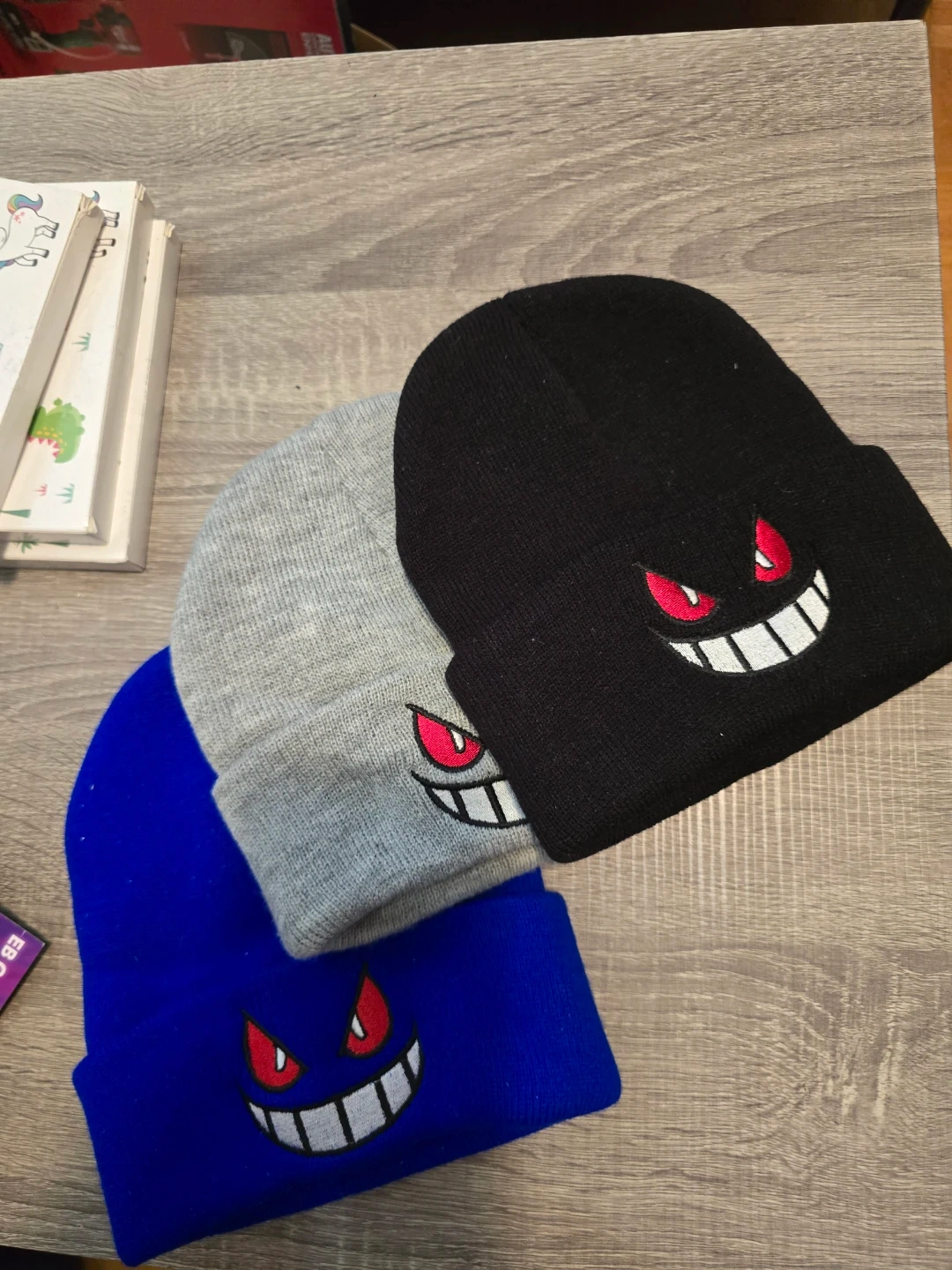 Three embroidered beanies featuring the Gengar Pokémon face. Includes blue, grey, and black colours. Knitted material.