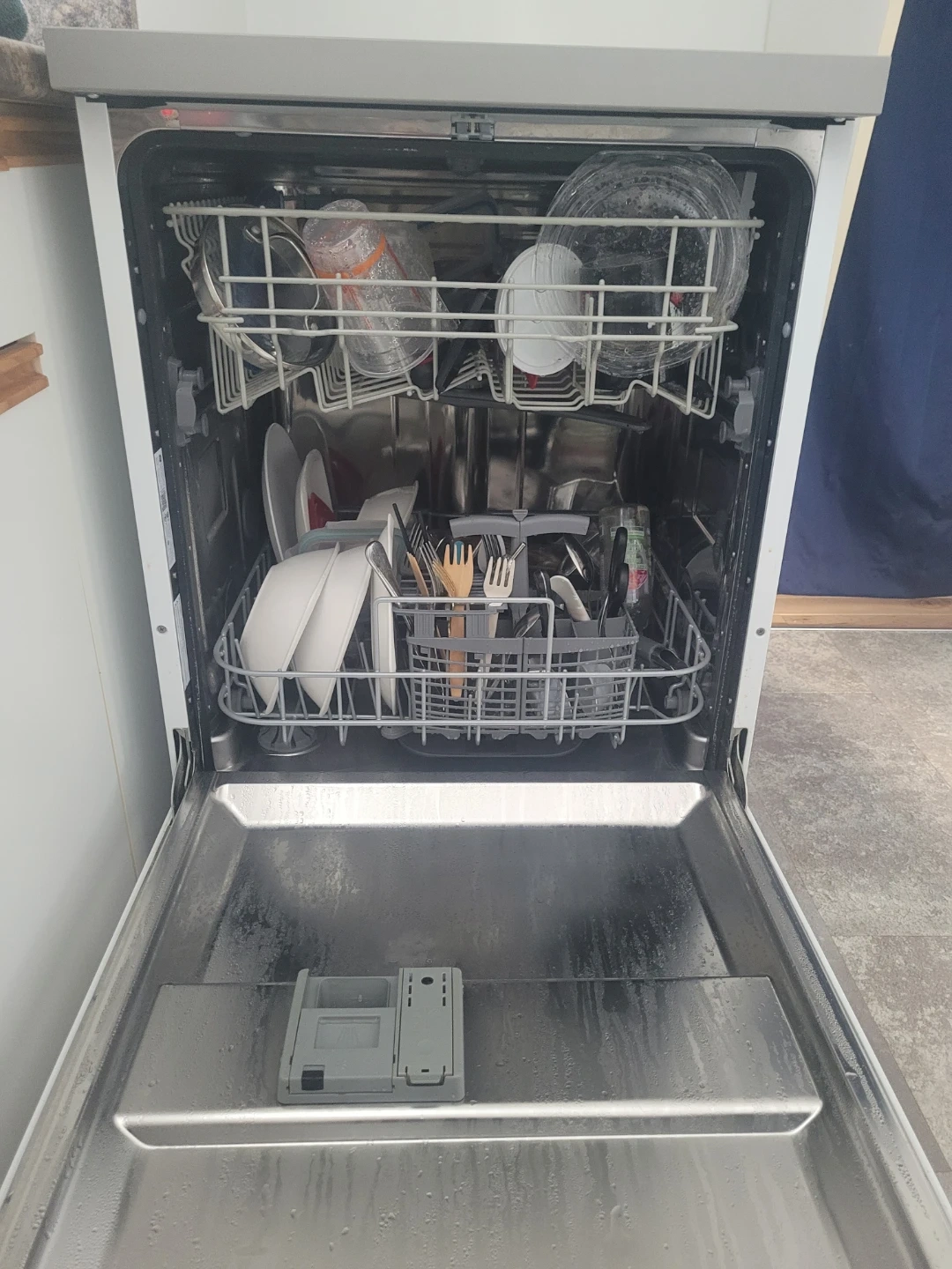 This is a white dishwasher with two racks and a cutlery basket. It's in good working order.