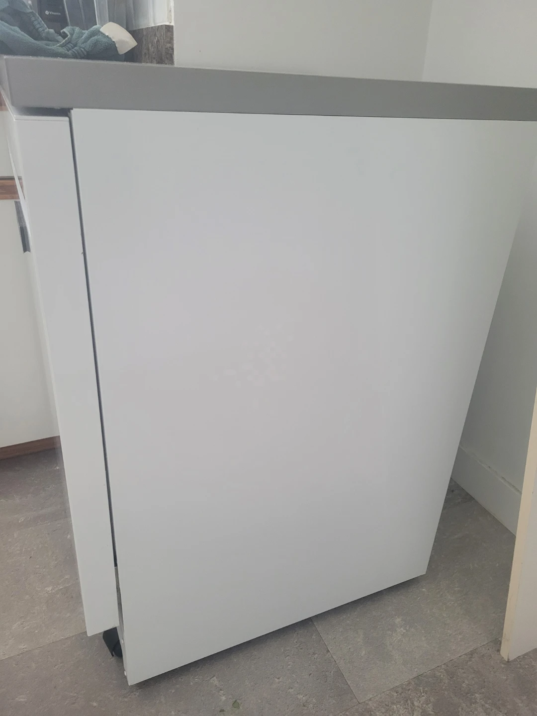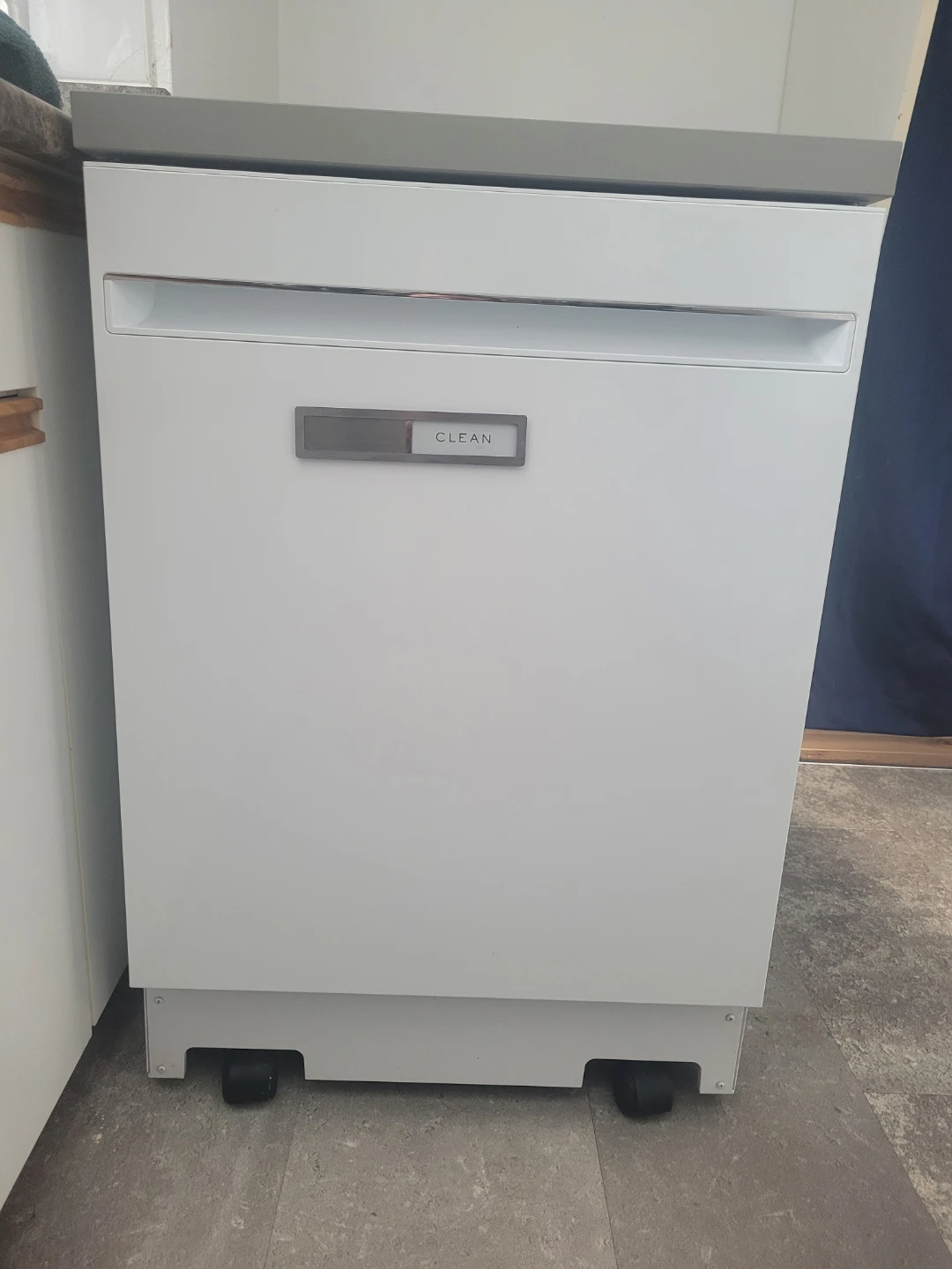 This is a white dishwasher with two racks and a cutlery basket. It's in good working order.