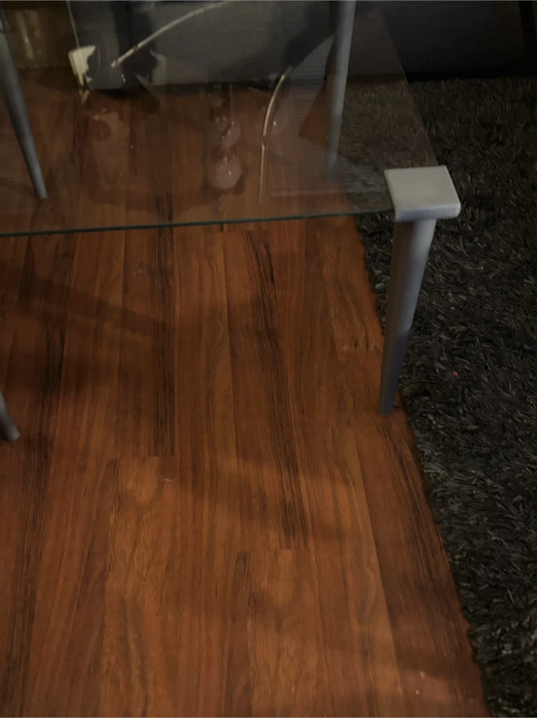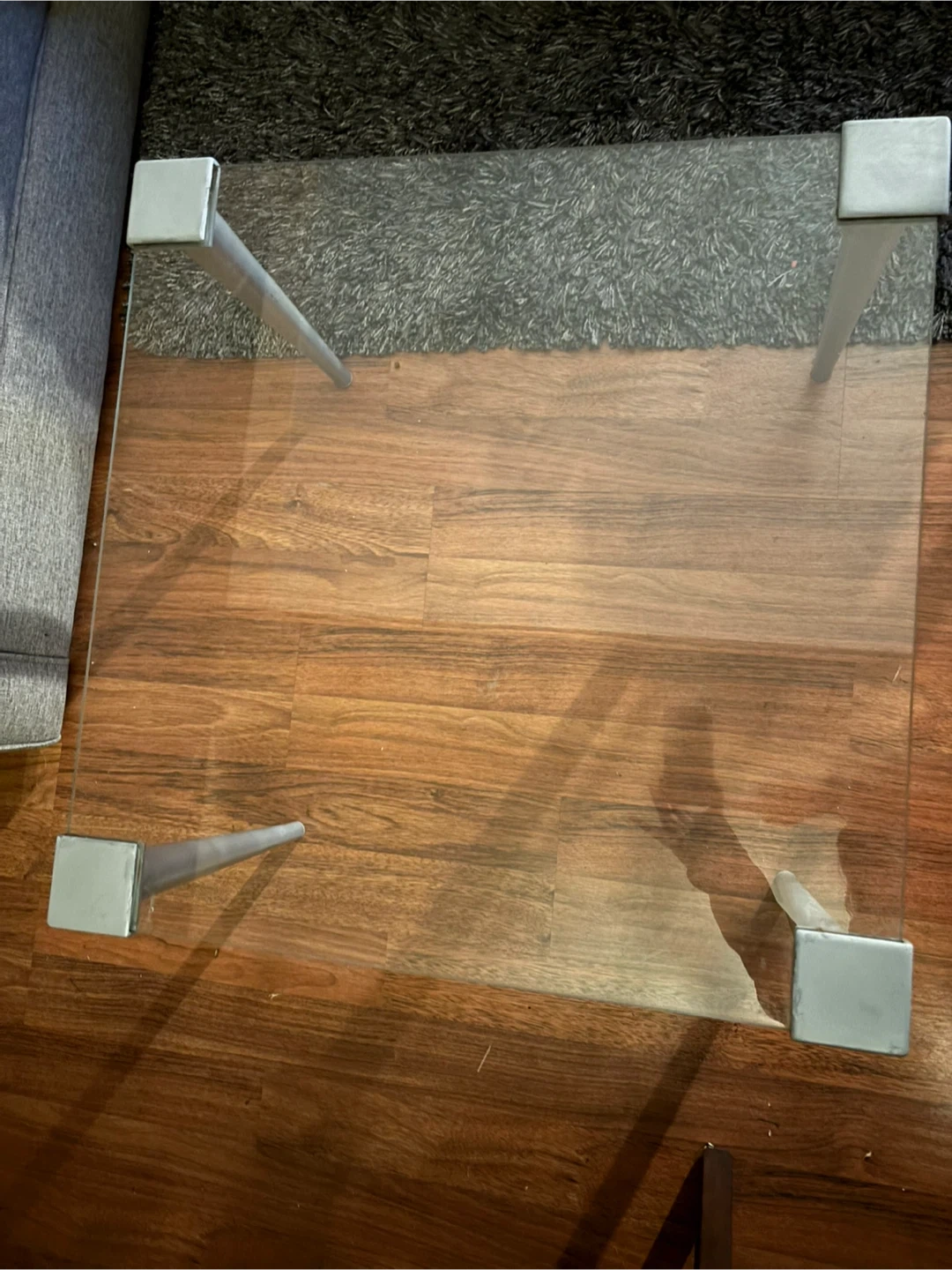 This coffee table features a clear glass top and grey metal legs. Side is around 70 cm long. It's a simple and modern design. The glass is tempered for durability.