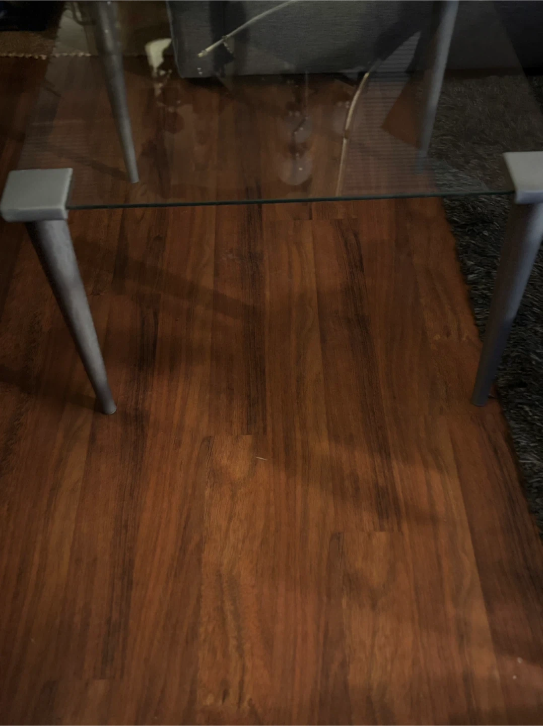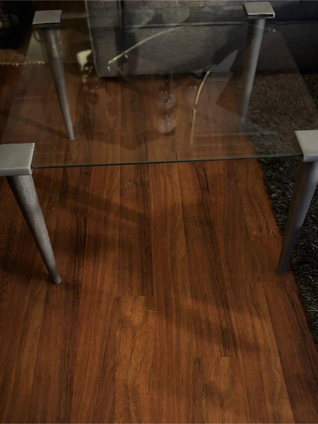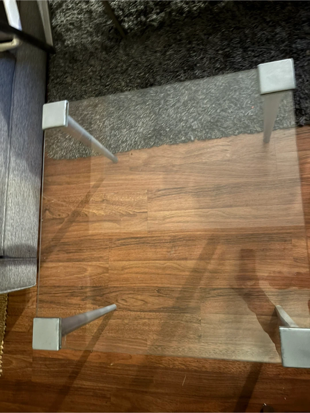 This coffee table features a clear glass top and grey metal legs. Side is around 70 cm long. It's a simple and modern design. The glass is tempered for durability.
