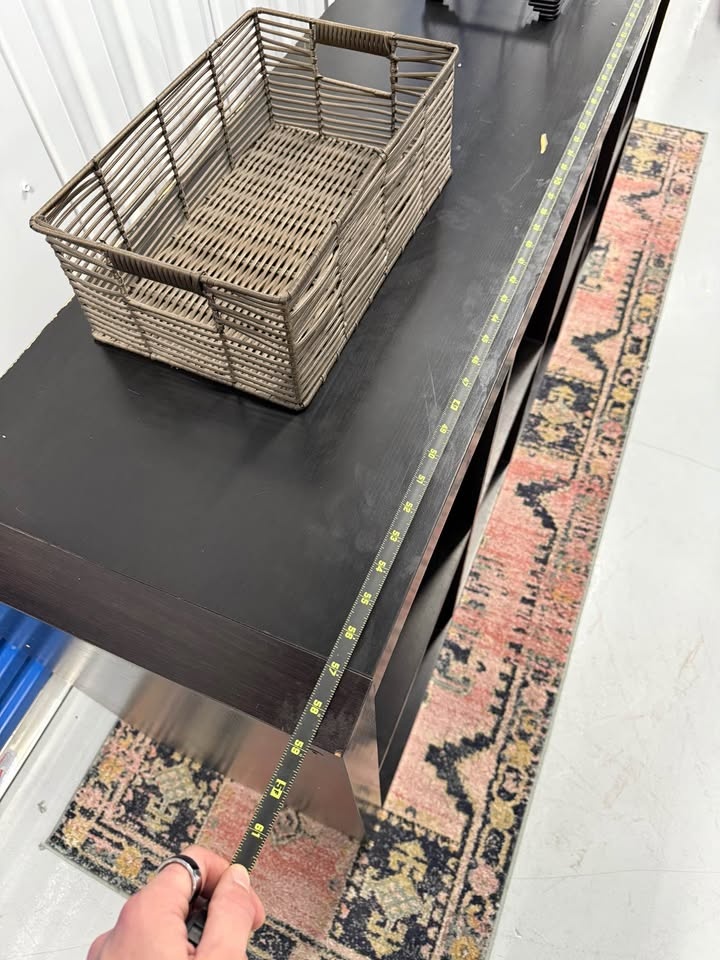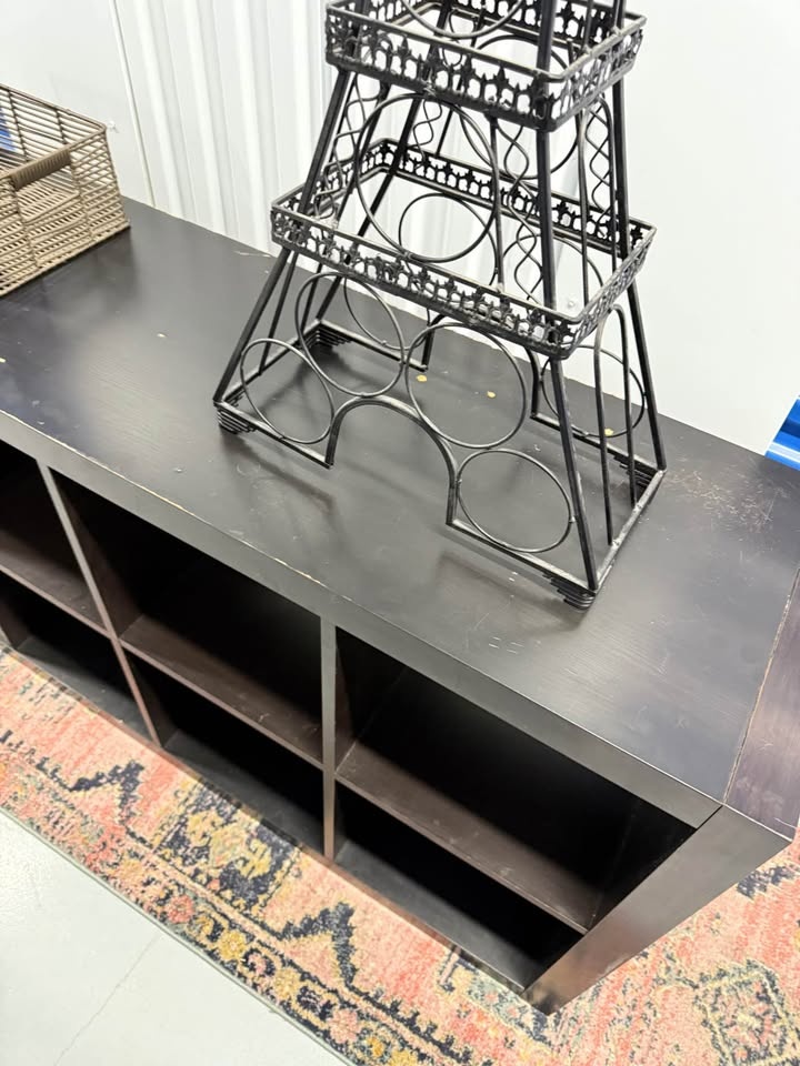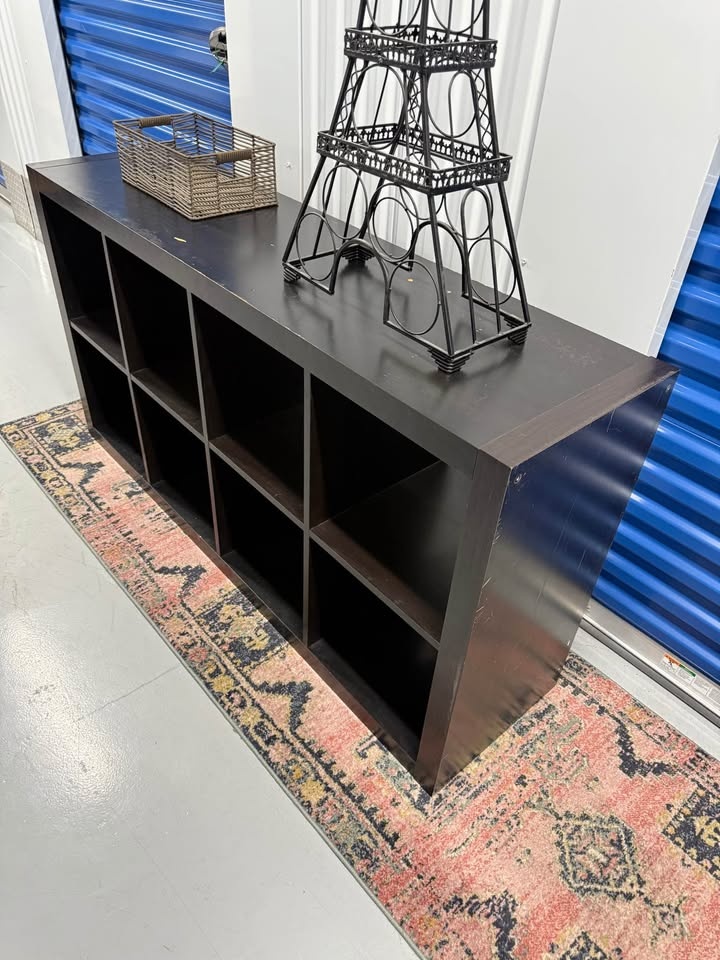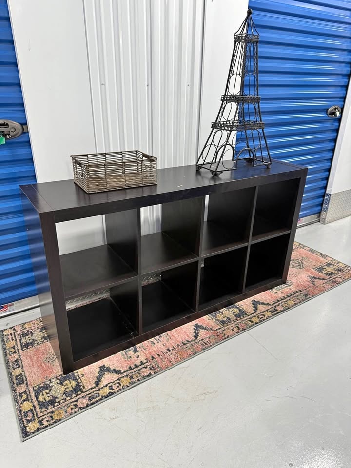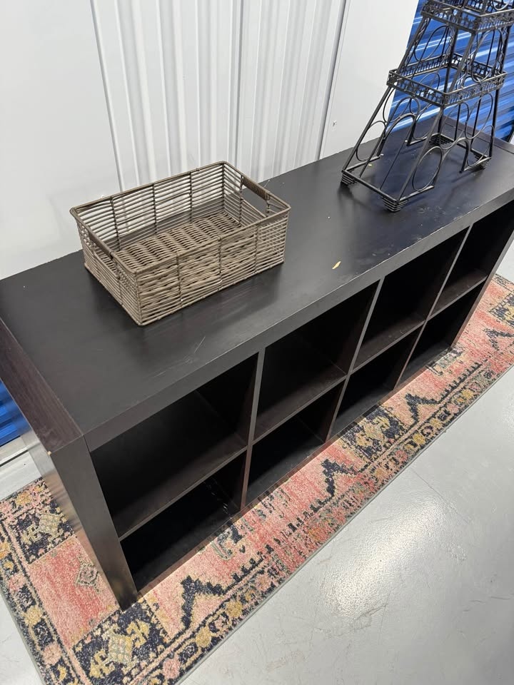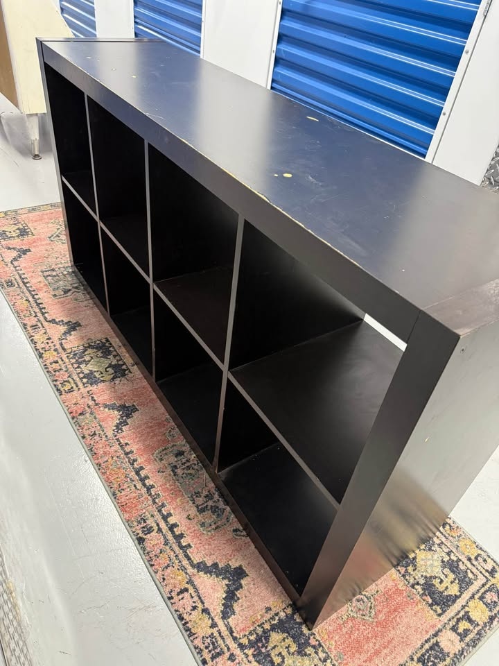 Solid wood 8 cube storage shelf, extremely sturdy and heavy. Not MDF or IKEA. This piece is strong enough for books, vinyl records, pottery, or even shop/retail display. Surface has scratches and marks from use, but it’s fully solid and can be refinished, painted, or used as is. Measurements: 57 x 31 x 16.