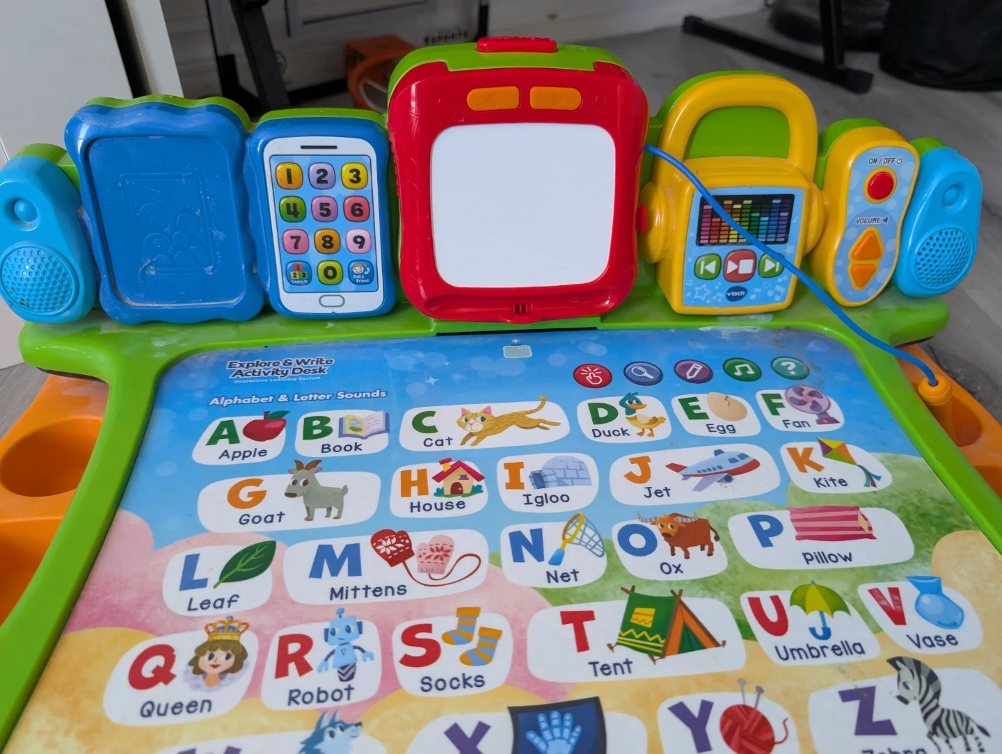 This VTech activity desk helps kids learn the alphabet and letter sounds. It's designed to be interactive with different learning stations. Includes detachable legs for the desk and the stool.
