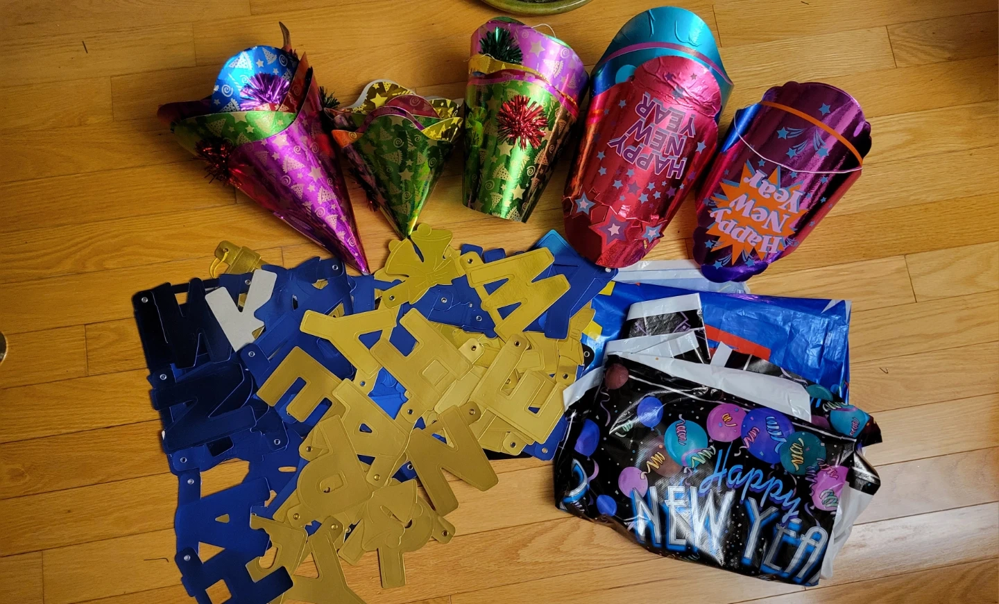 35 hats, 3 gold and blue Happy New Year Ketter banners, a table cloth, a wall/door banner