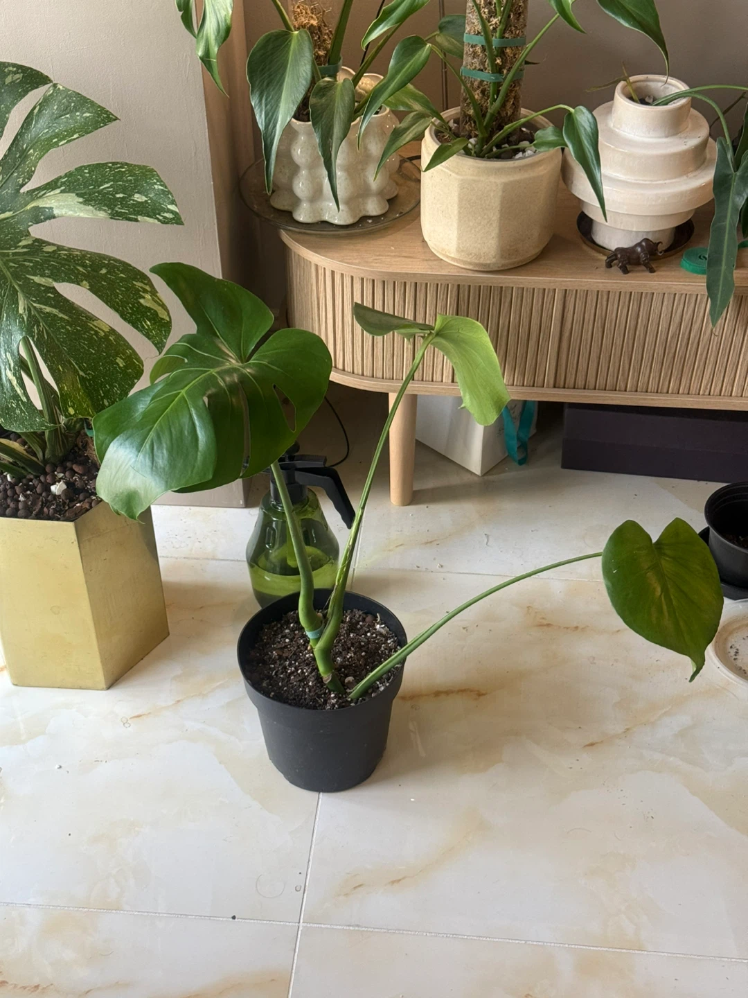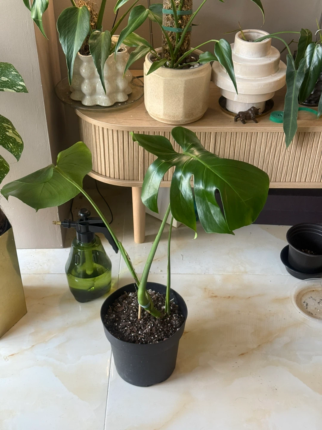 a healthy Monstera plant, potted in a simple 9” black nursery pot. It's a beautiful addition to any indoor space and relatively easy to care for. The leaves are a vibrant green, decent size. Pick up from queens Elmhurst