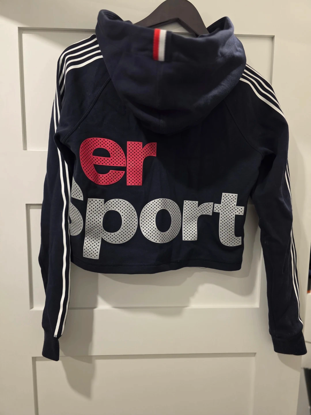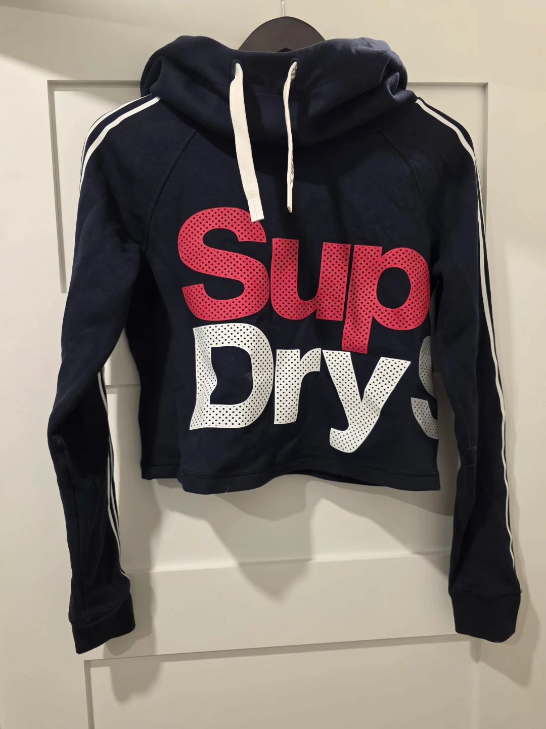 A navy Superdry Sport hoodie with signature branding on the front and back. Features stripes on the sleeves. Made in China. UK size 6, US size 2, EU size 34.