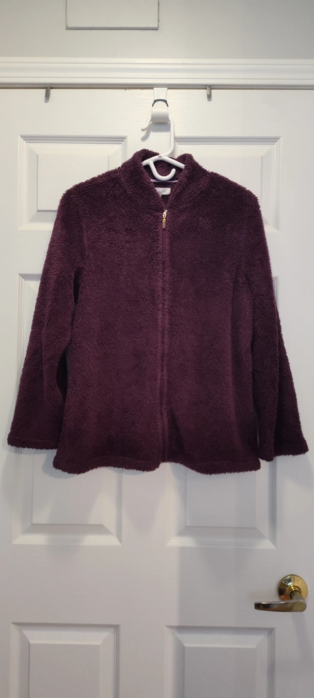 Cozy plum-coloured fuzzy fleece jacket. It features a full zip-up front and a mock neck collar. Made from a soft polyester material for warmth.
