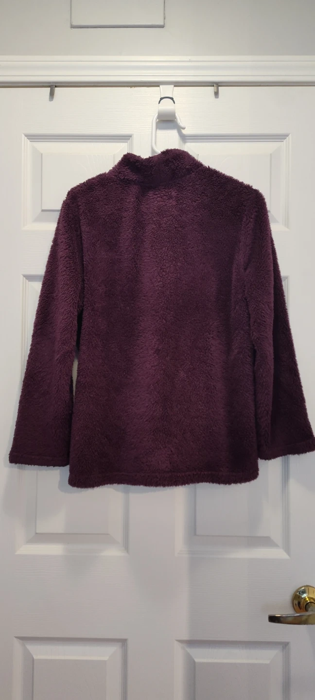 Cozy plum-coloured fuzzy fleece jacket. It features a full zip-up front and a mock neck collar. Made from a soft polyester material for warmth.