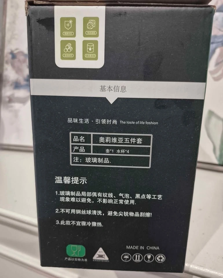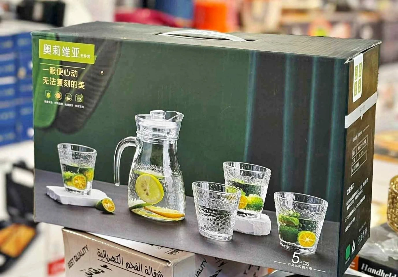 Brand new glass water jug set with four matching glasses and a lid, designed for serving water, juice, and other cold beverages. All new, never opened box.