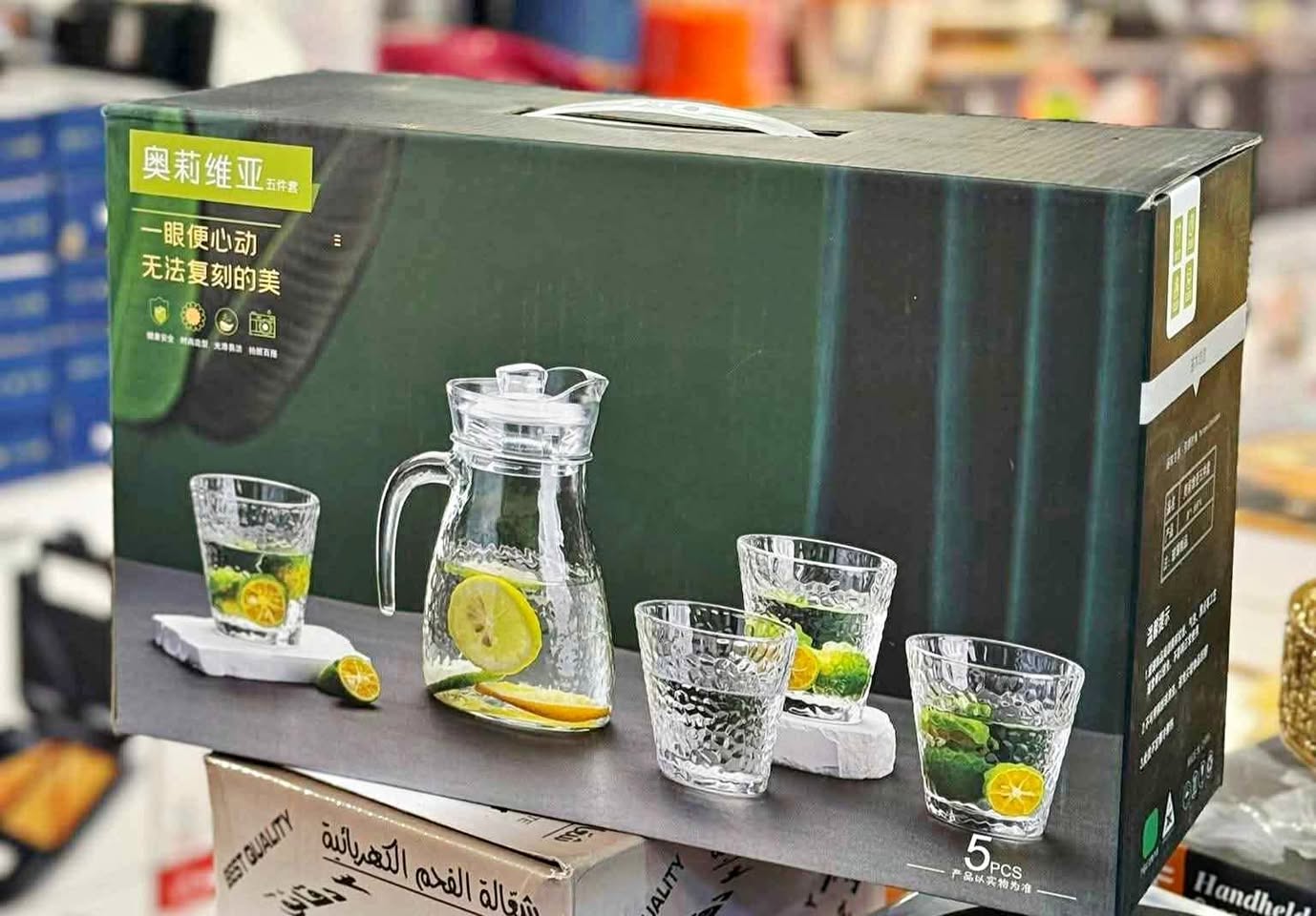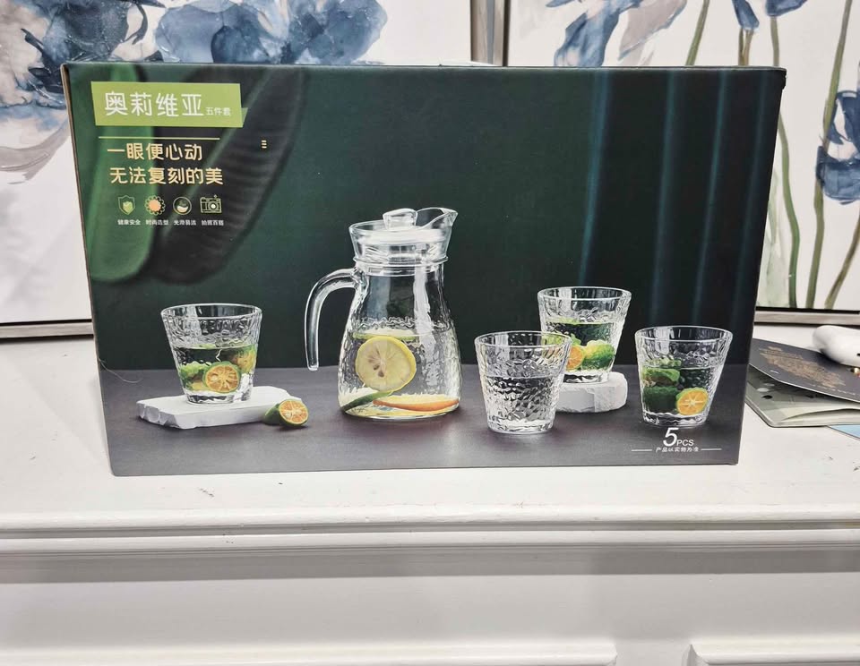 Brand new glass water jug set with four matching glasses and a lid, designed for serving water, juice, and other cold beverages. All new, never opened box.