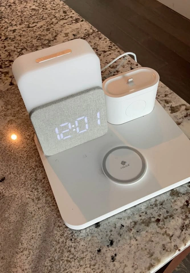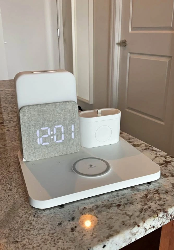 Modern 3-in-1 charging station with a built-in digital clock and speaker, perfect for your bedside or desk. Features a wireless charging pad for your phone, a charging dock for AirPods, and an LED digital clock display. It has a compact, aesthetic design. Lightly used and fully working. Great for decluttering cables and keeping everything in one place. Pickup available at Esplanade & Yonge.