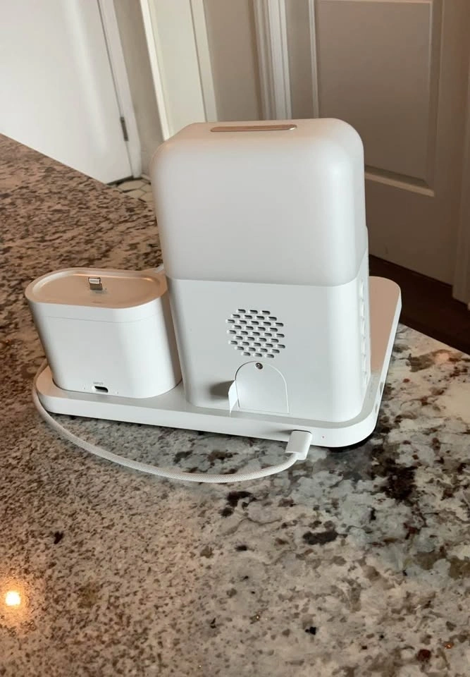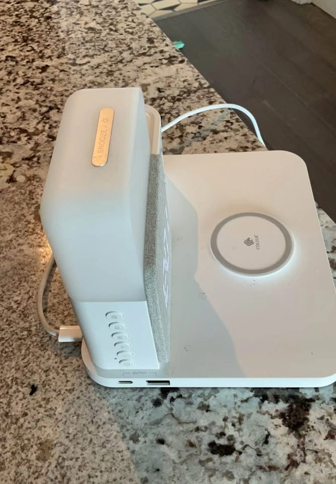 Modern 3-in-1 charging station with a built-in digital clock and speaker, perfect for your bedside or desk. Features a wireless charging pad for your phone, a charging dock for AirPods, and an LED digital clock display. It has a compact, aesthetic design. Lightly used and fully working. Great for decluttering cables and keeping everything in one place. Pickup available at Esplanade & Yonge.