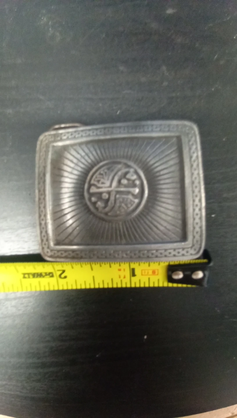 This is a metal belt buckle with a sunburst design and intricate detailing in the center. It's marked "Jesse McCord Tradition". It measures approximately 2.5 inches by 2.5 inches.