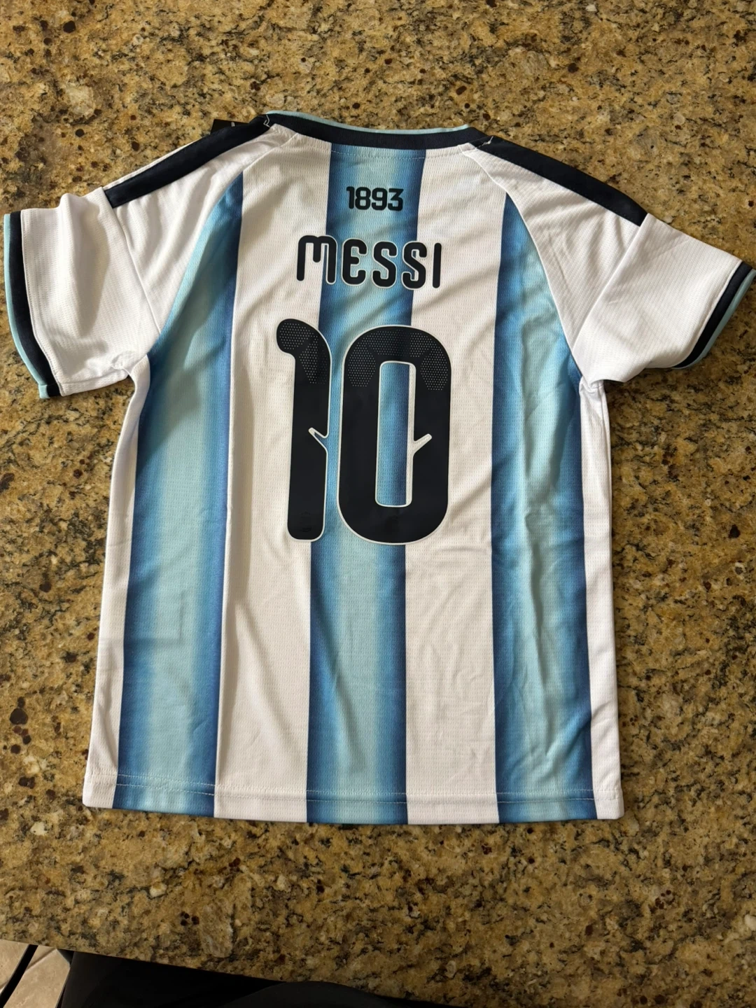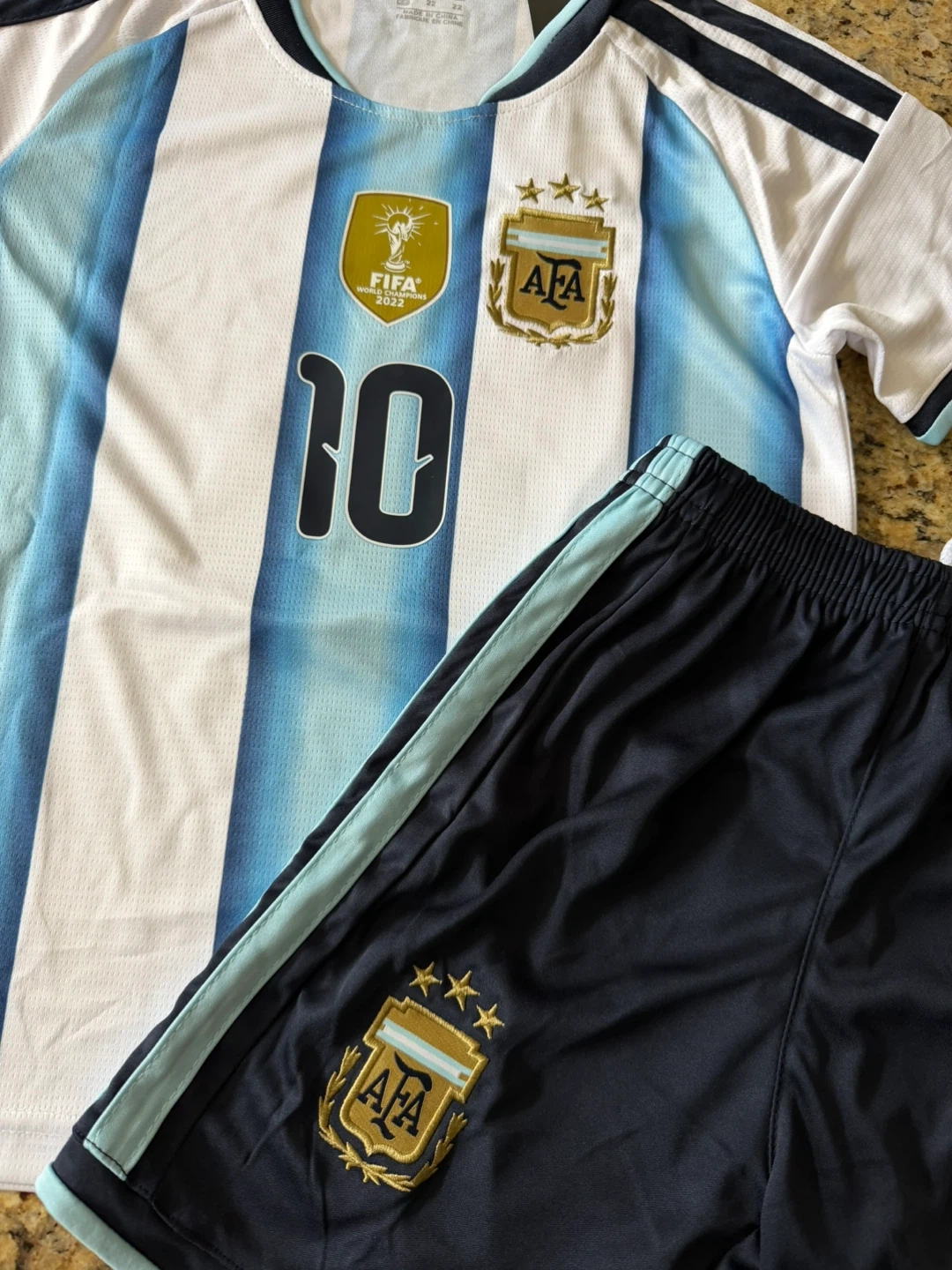 This is a Messi #10 Argentina soccer jersey and shorts set. Features the FIFA World Cup 2022 patch and the AFA crest.