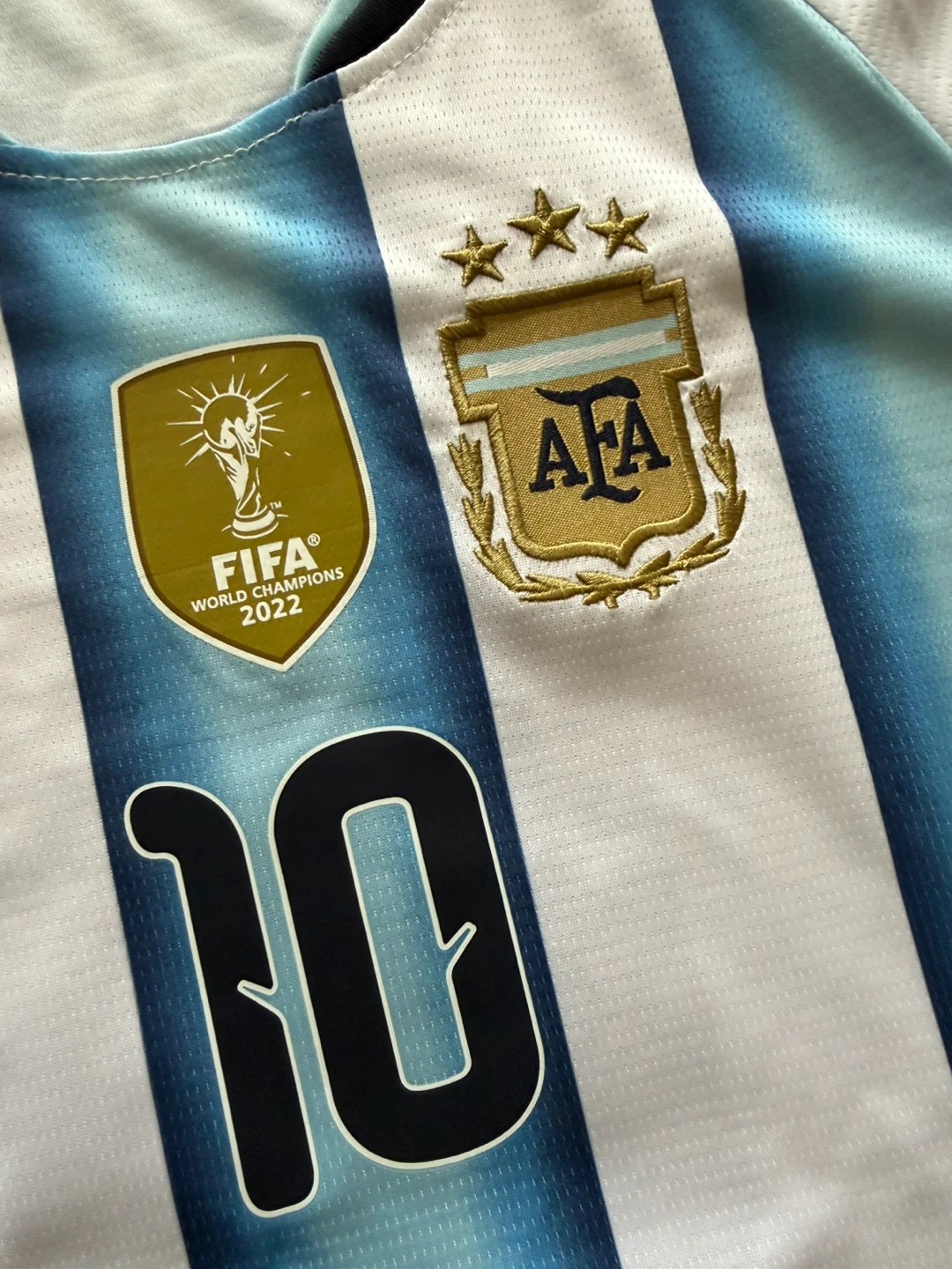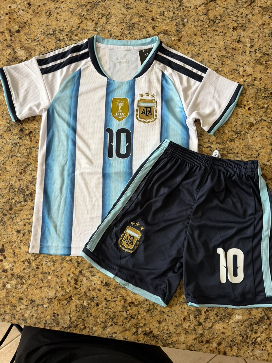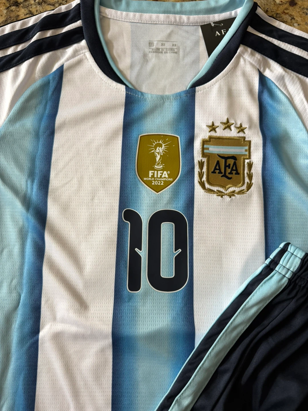 This is a Messi #10 Argentina soccer jersey and shorts set. Features the FIFA World Cup 2022 patch and the AFA crest.