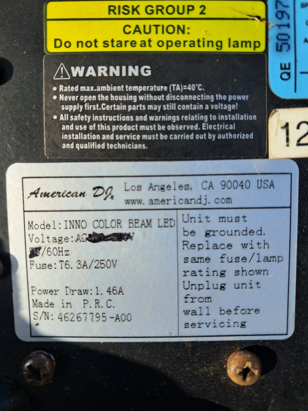 This is an American DJ INNO COLOR BEAM LED moving head light. It's powered by AC 100-240V/50/60Hz and has a power draw of 1.46A. It's made in P.R.C. This light is suitable for stage or event lighting setups.