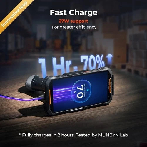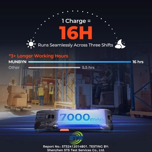 This is a MUNBYN AceScan AS01P barcode scanner, running Android 14 and upgradable to Android 18. It features a 6-inch touchscreen with 2160x1080 resolution, a Zebra SE4710 scanner for high accuracy, and scans barcodes up to 24 inches away. The device has a 7,000 mAh battery for long-lasting use, supporting 27W fast charging. It's built tough with IP65 compliance and 6.6 ft drop resistance (MIL-STD 810H certified). It also has a lightweight, non-slip grip and a dual-trigger system for comfortable, efficient operation. Includes a 2-year protection plan and 24/7 customer support. Battery powered, with Bluetooth, USB Cable, and Wi-Fi connectivity. One Lithium Metal battery included.