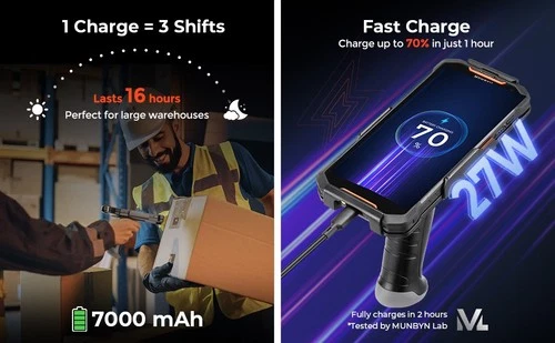 This is a MUNBYN AceScan AS01P barcode scanner, running Android 14 and upgradable to Android 18. It features a 6-inch touchscreen with 2160x1080 resolution, a Zebra SE4710 scanner for high accuracy, and scans barcodes up to 24 inches away. The device has a 7,000 mAh battery for long-lasting use, supporting 27W fast charging. It's built tough with IP65 compliance and 6.6 ft drop resistance (MIL-STD 810H certified). It also has a lightweight, non-slip grip and a dual-trigger system for comfortable, efficient operation. Includes a 2-year protection plan and 24/7 customer support. Battery powered, with Bluetooth, USB Cable, and Wi-Fi connectivity. One Lithium Metal battery included.