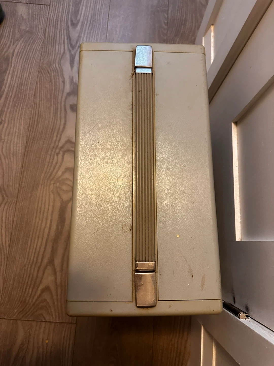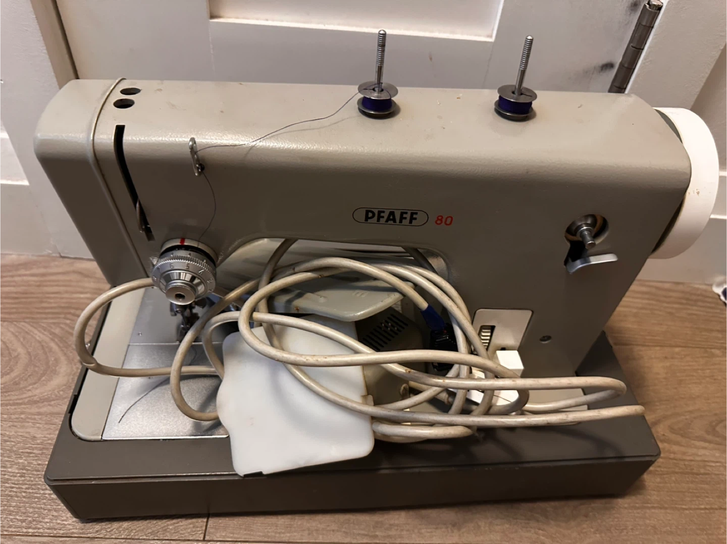 Pfaff 80 heavy duty sewing machine with a metal case. It has two spools of thread on top, ready for sewing. This machine is great for home repairs or crafting projects! It’s quite heavy to carry but once it’s on a table it’s great.