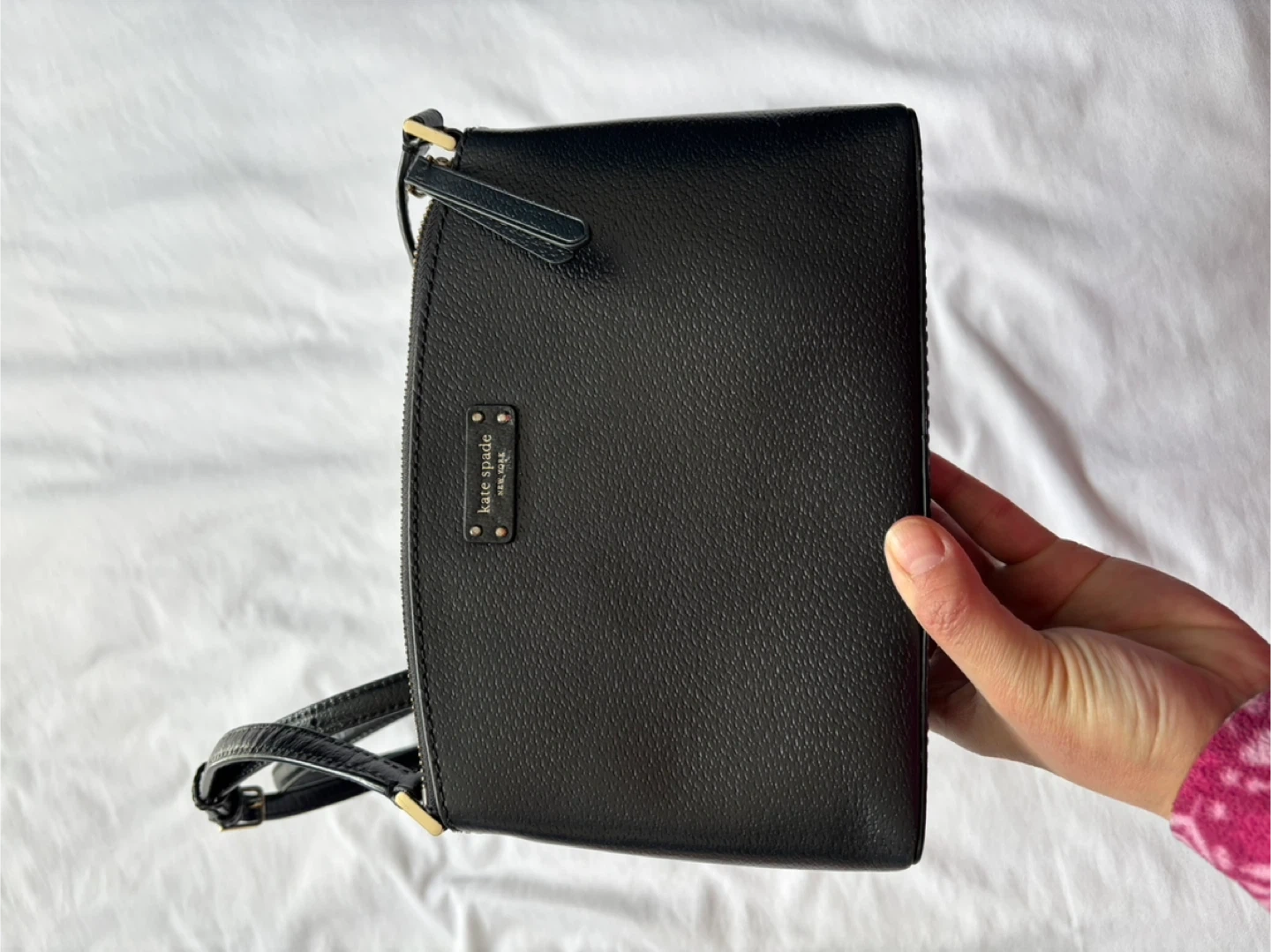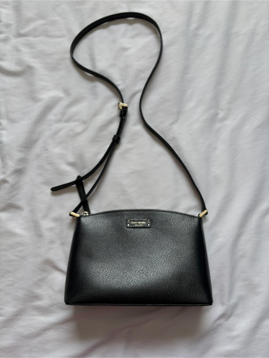 This is a black pebbled leather Kate Spade crossbody bag. It features a zippered closure and an adjustable strap. The interior is lined with signature spade print fabric.