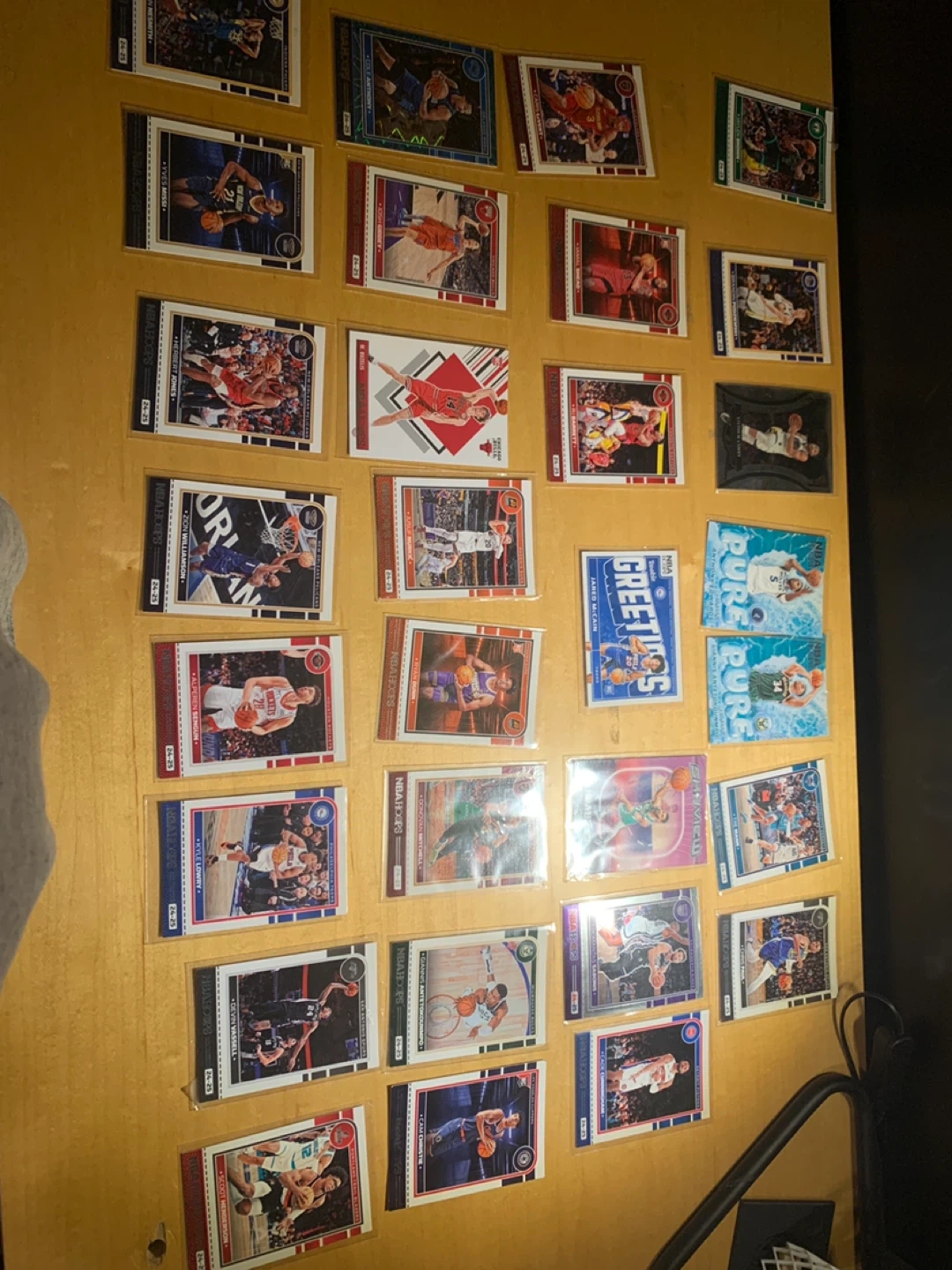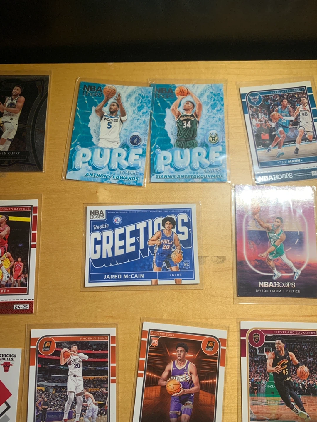 Collection of NBA Hoops trading cards featuring various players. Cards include Anthony Edwards, Giannis Antetokounmpo, and Jayson Tatum. Excellent addition for any basketball card collector! (BUY SEPARATELY OR ALL TOGETHER) (slide 3 features cards on the main page that have glair on slide one) ALL IN CASES