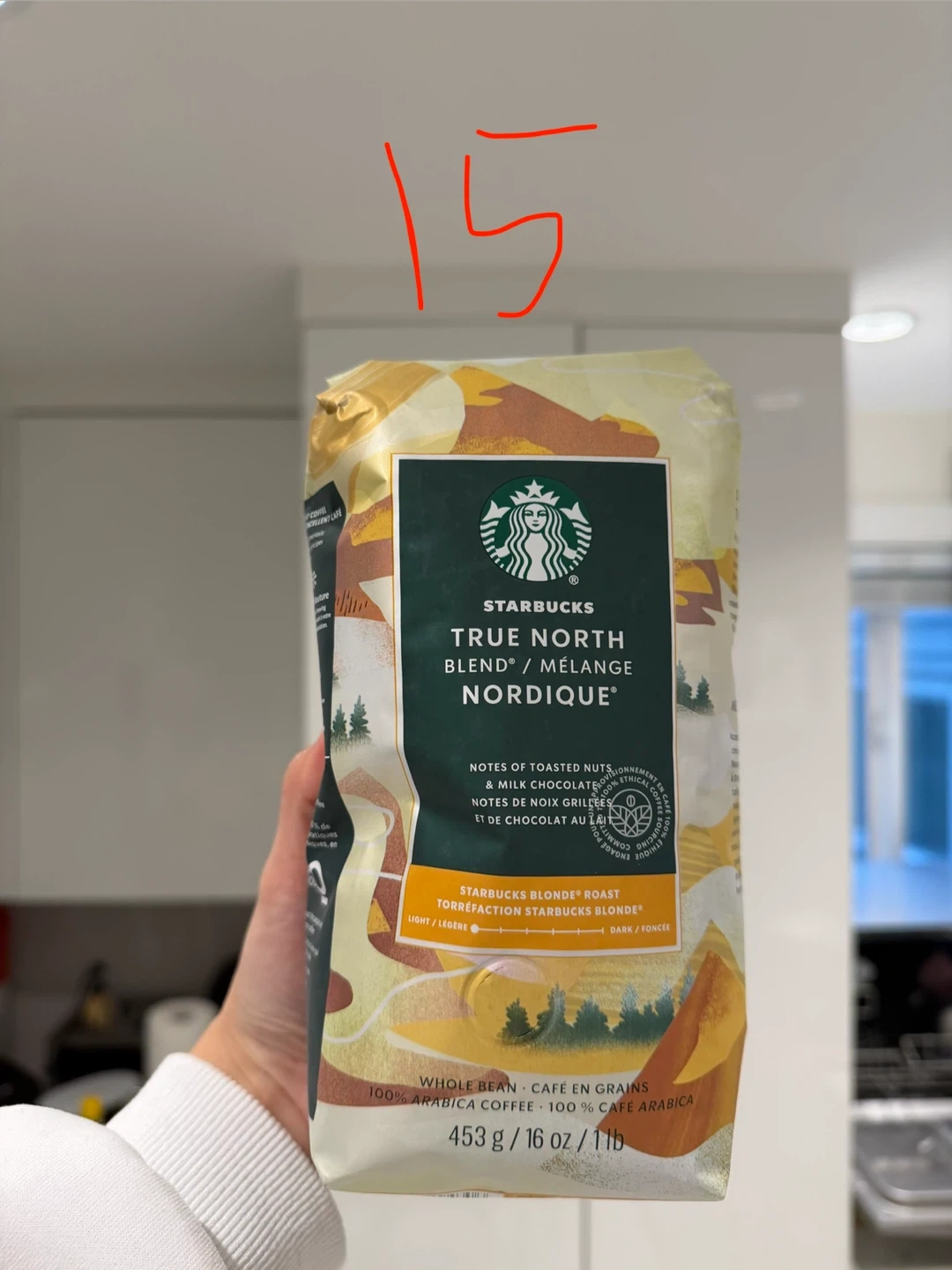 Three bags of Starbucks whole bean 100% Arabica coffee. Includes True North Blend (Blonde Roast), 1971 Roast (Dark Roast), and Espresso Roast (Dark Roast). Each bag is 453g / 16 oz / 1lb. Notes include toasted nuts, milk chocolate, sugar, and rich walnut.